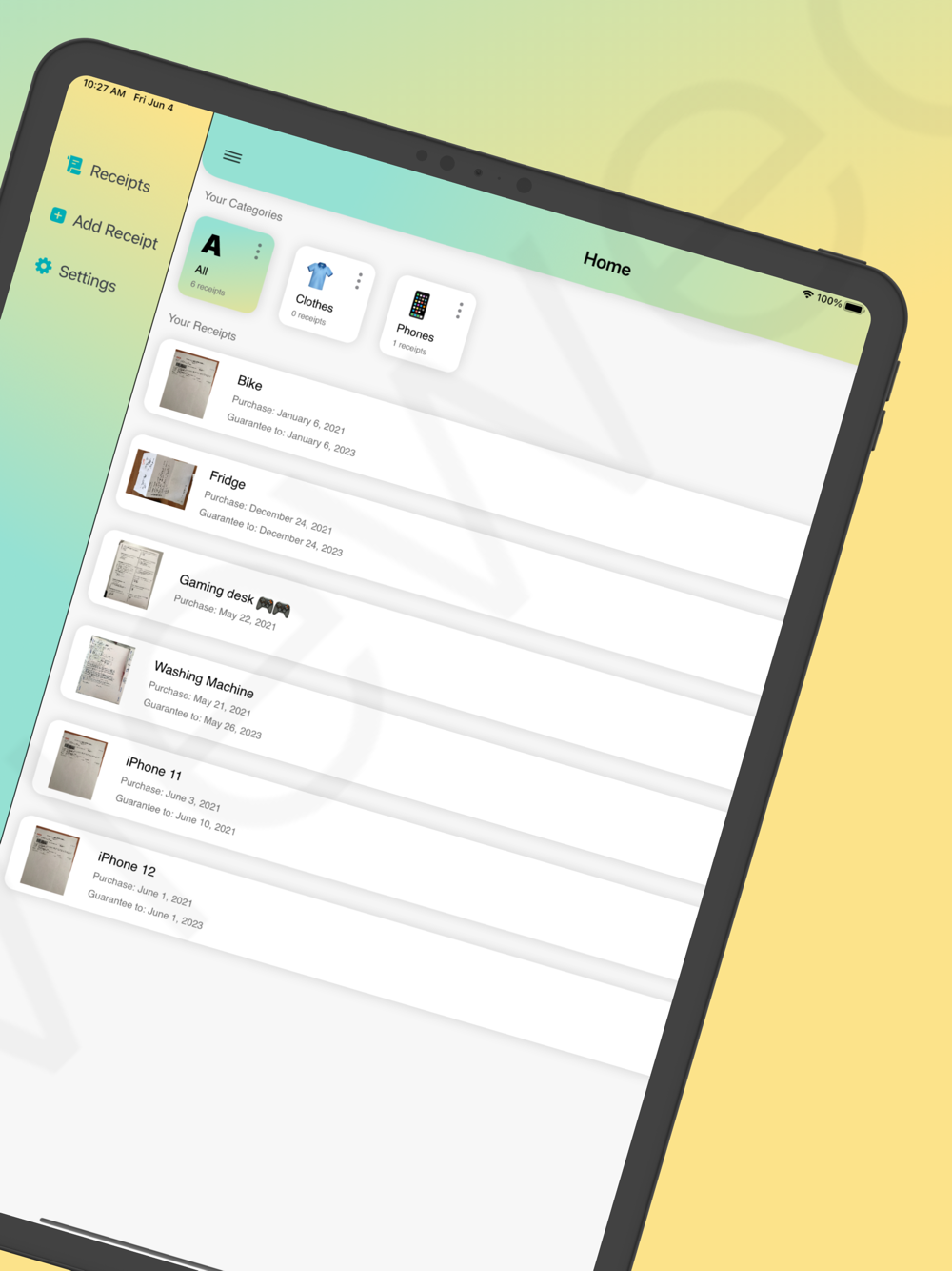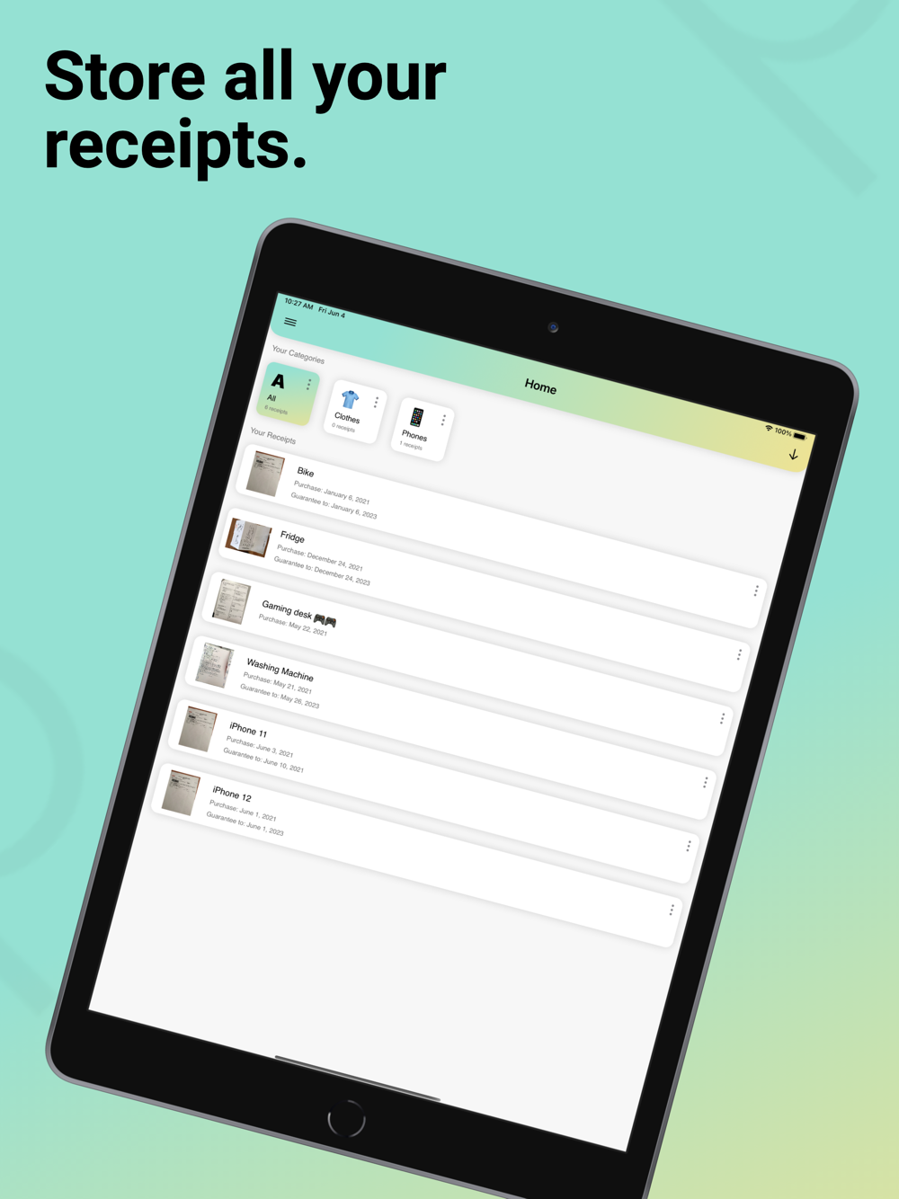 Experience effortless management of your purchases with this application. Store digital copies of your receipts, categorize them based on your preferences, and receive timely reminders. Never miss a warranty expiration again – the application will ensure you stay informed. Simplify your life by keeping track of purchases and warranty periods in one convenient location.