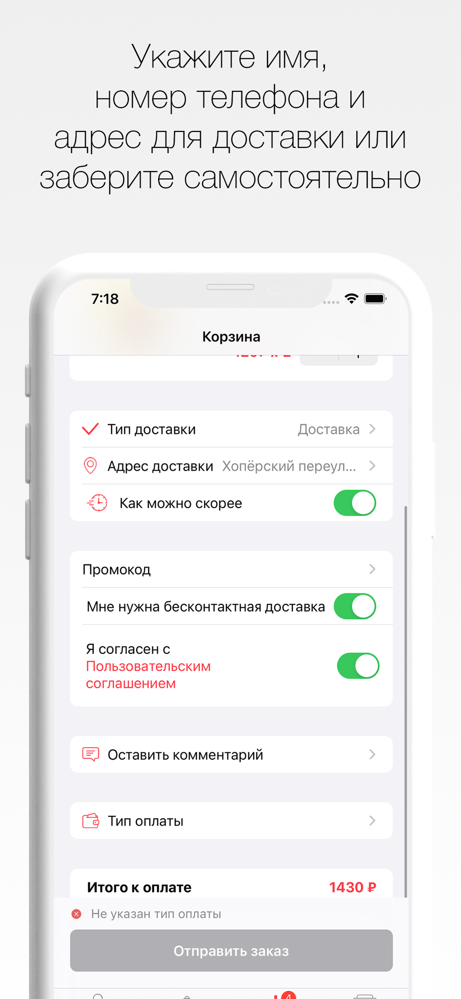 На экране заказа добавьте свою контактную информацию для первого заказа: Имя, Номер телефона и адрес электронной почты, чтобы получать уведомления об оплате.