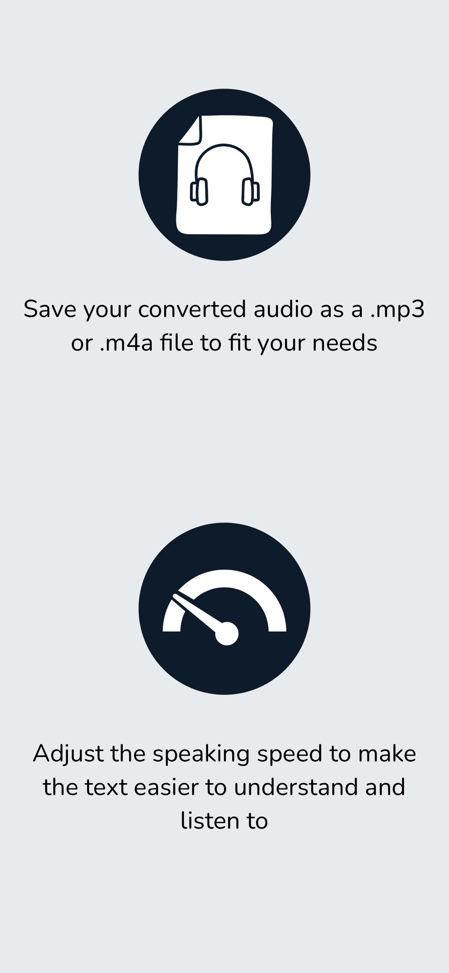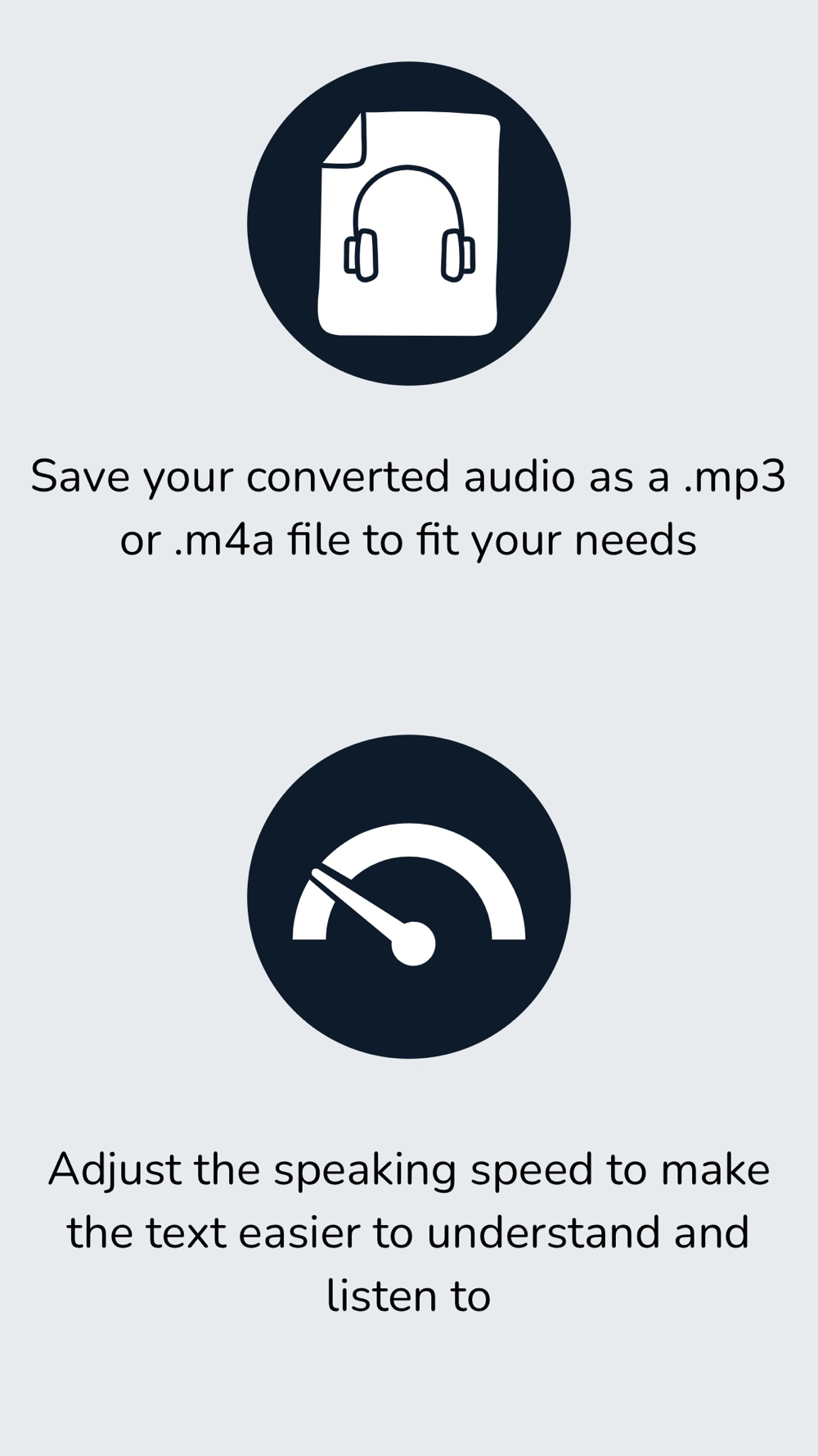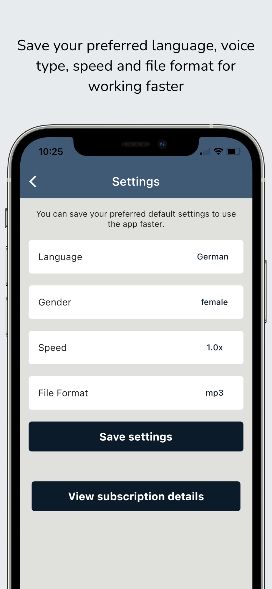 If you typically convert audio in one language, voice type, speed and file format, you can save your personal preferences so you can quickly enter your text, tap „convert“ and go!