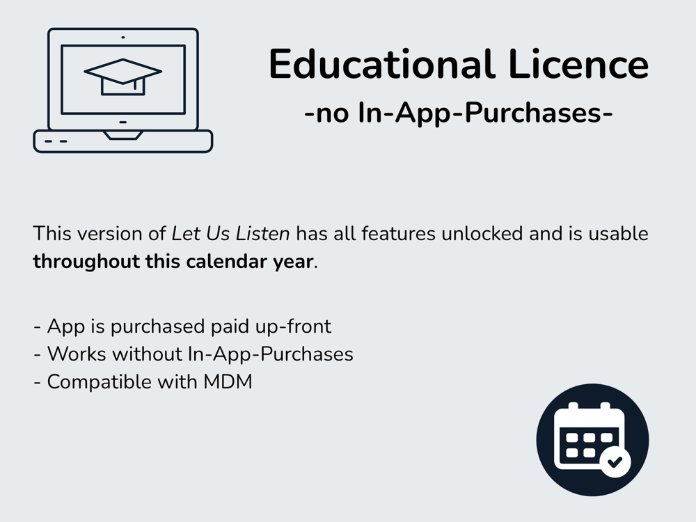 Let Us Listen EDU is suitable for educational institutions using MDM services to distribute apps to staff and student devices.