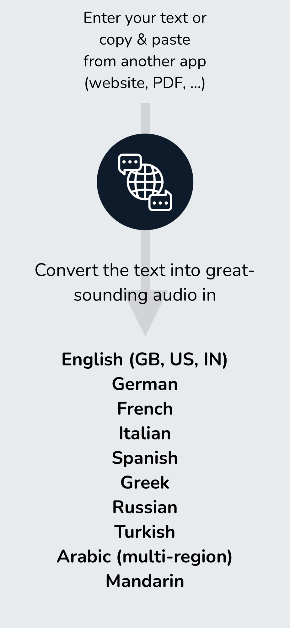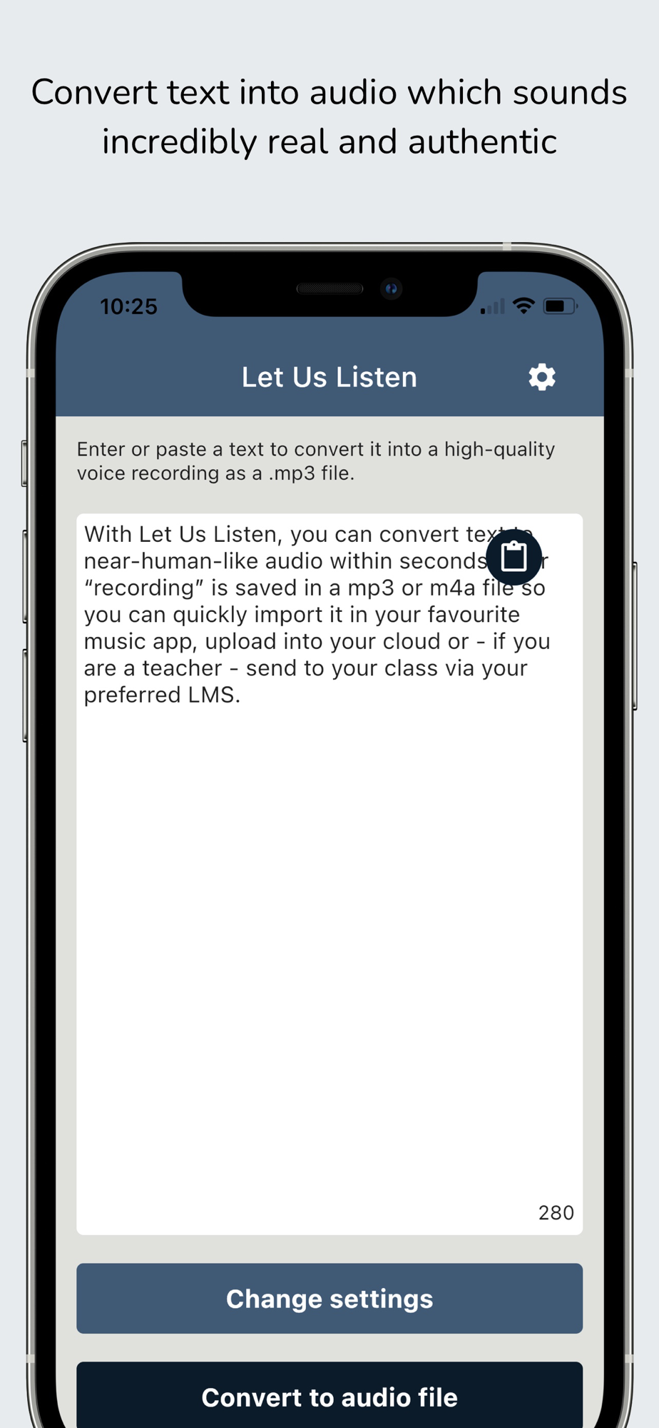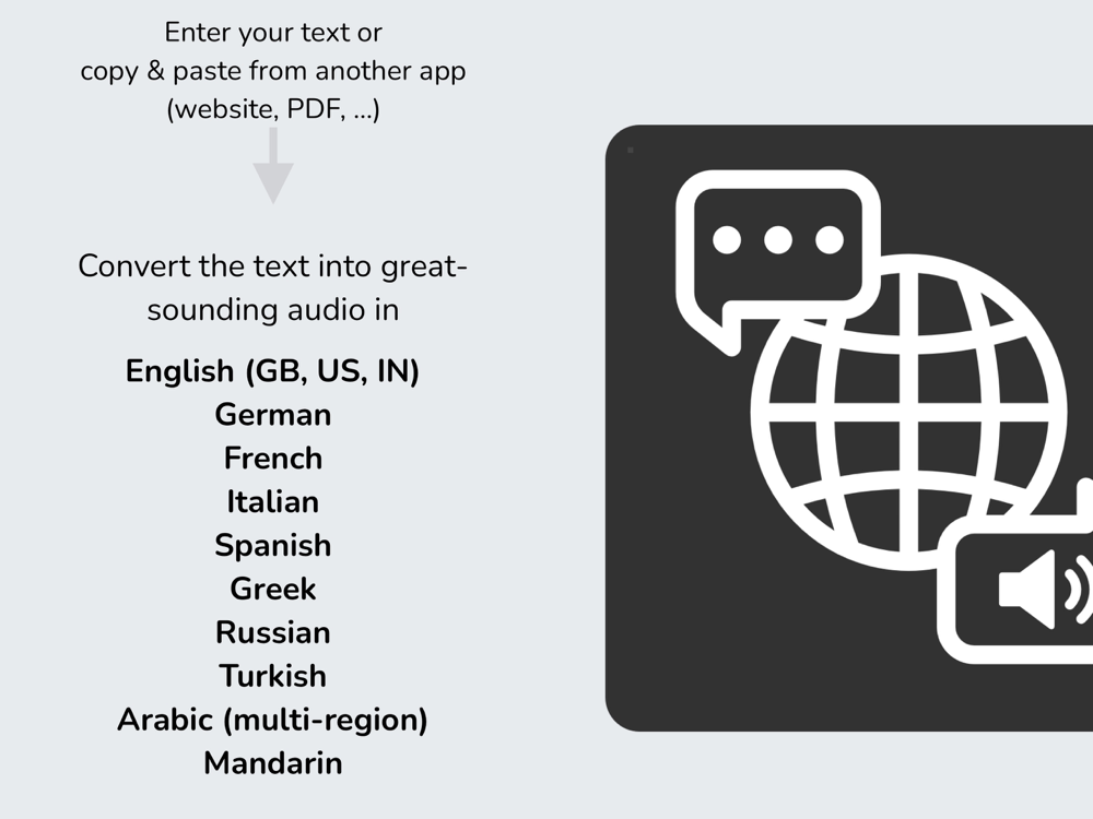 Let Us Lisen lets you enter text or quickly paste text from other apps, like your browser, a PDF reader or other sources for the content you want to convert.