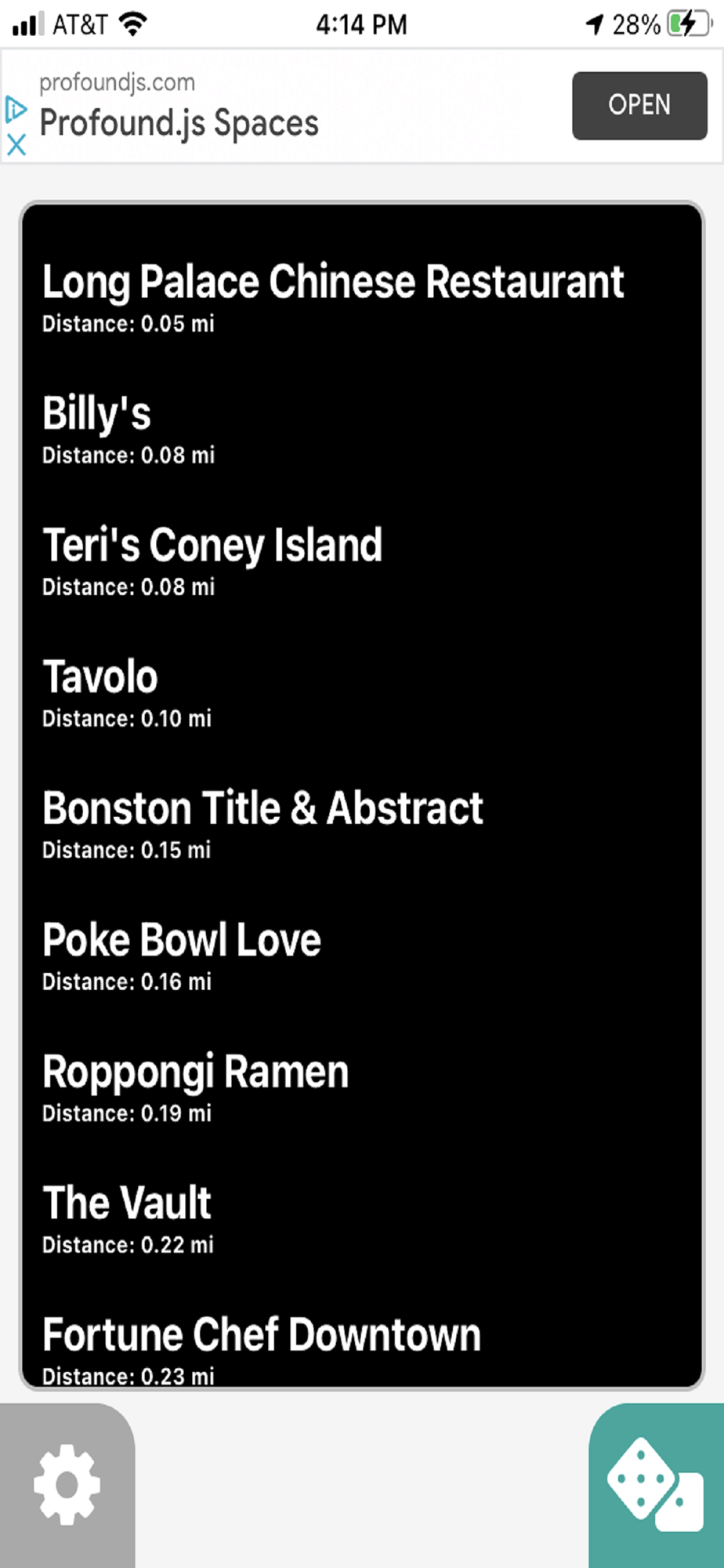 CityFood! provides you with a list of restaurants within your vicinity. Click on a place to see details about the restaurant and/or get directions. Can't decide on where to eat? Click the dice to have a random option shown. Never stress about finding a place to eat again!