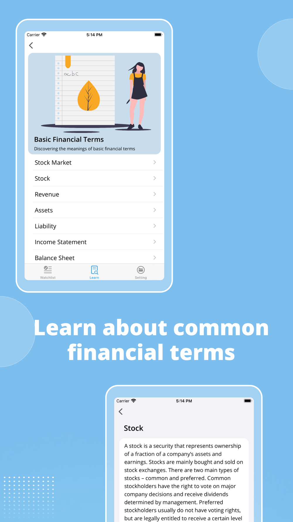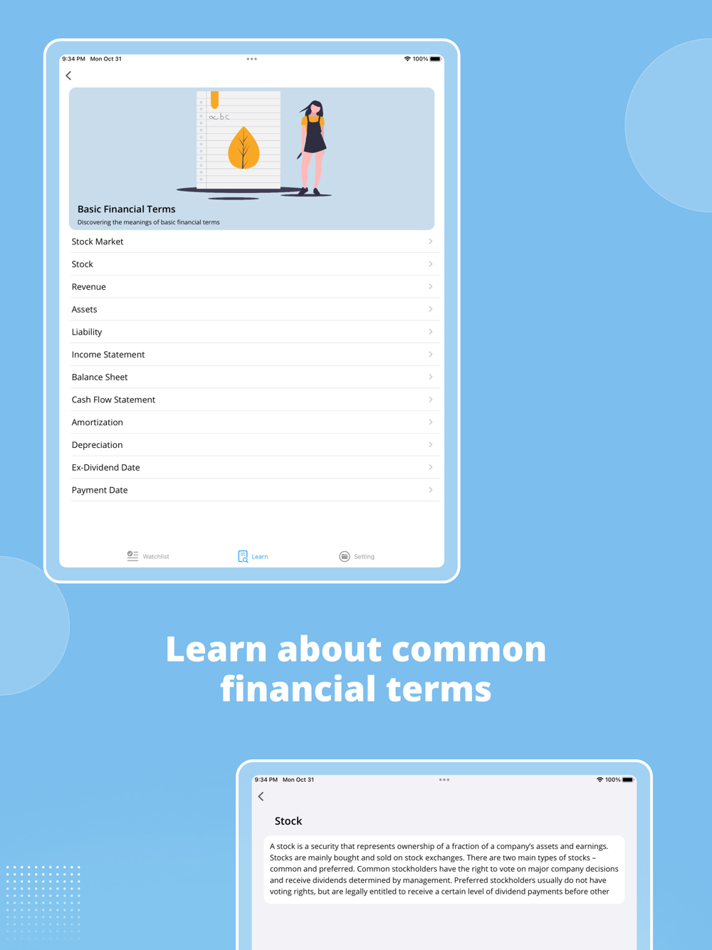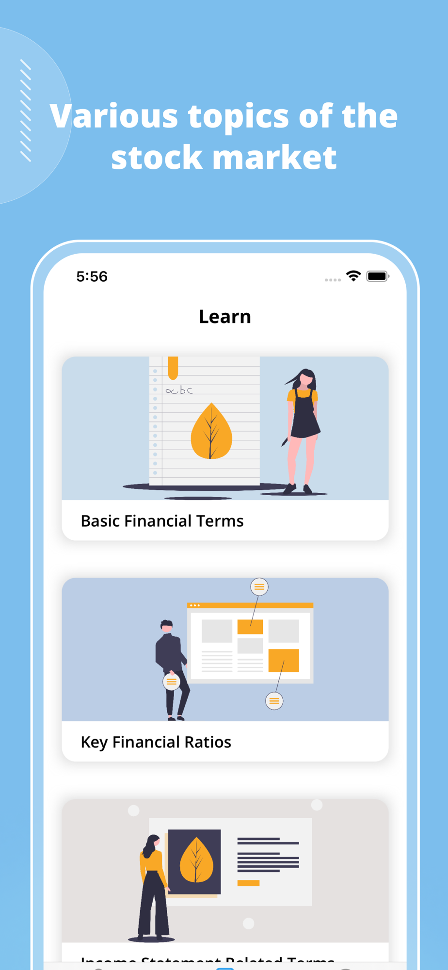 * Learning: concise and easy-to-understanding explanation of elemental financial terms to improve your understanding of investment.