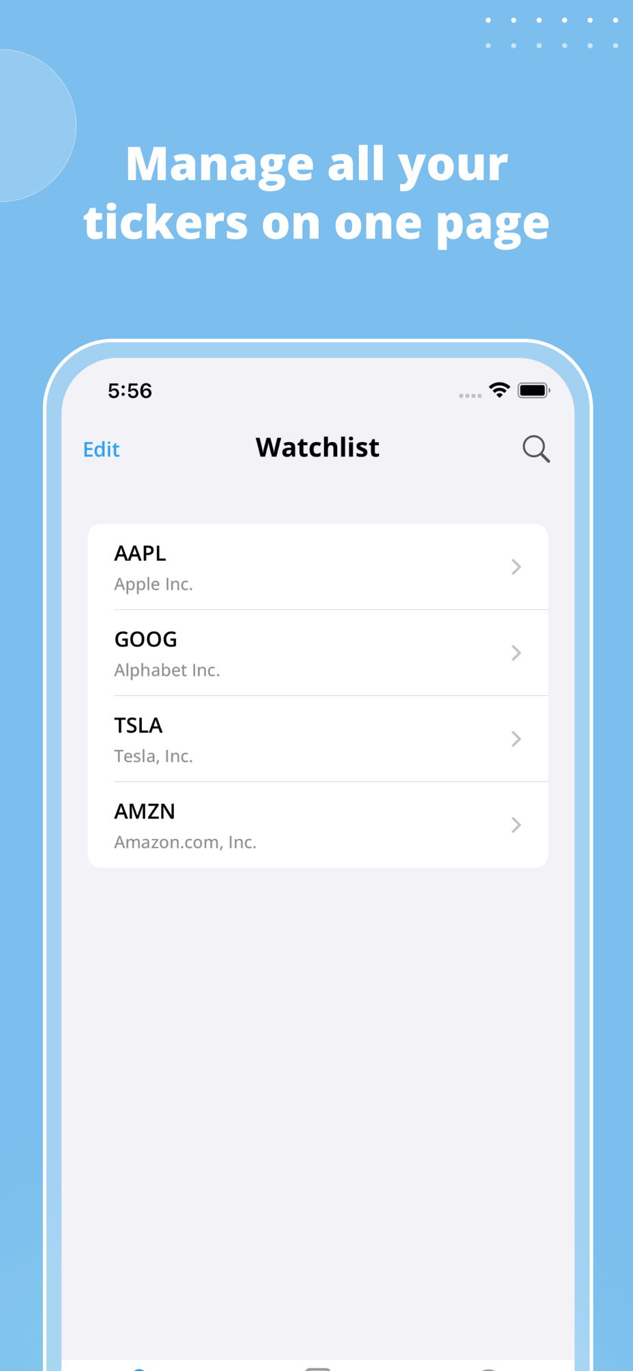 * WatchList: easily keep track of your favorite stock and get its latest financial information.