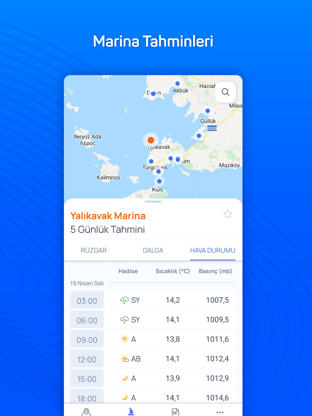 - Marinaların 3 saatlik periyotlarla 5 günlük hava tahmin verilerine ulaşabilir, marinaları favorilerinize ekleyebilirsiniz.