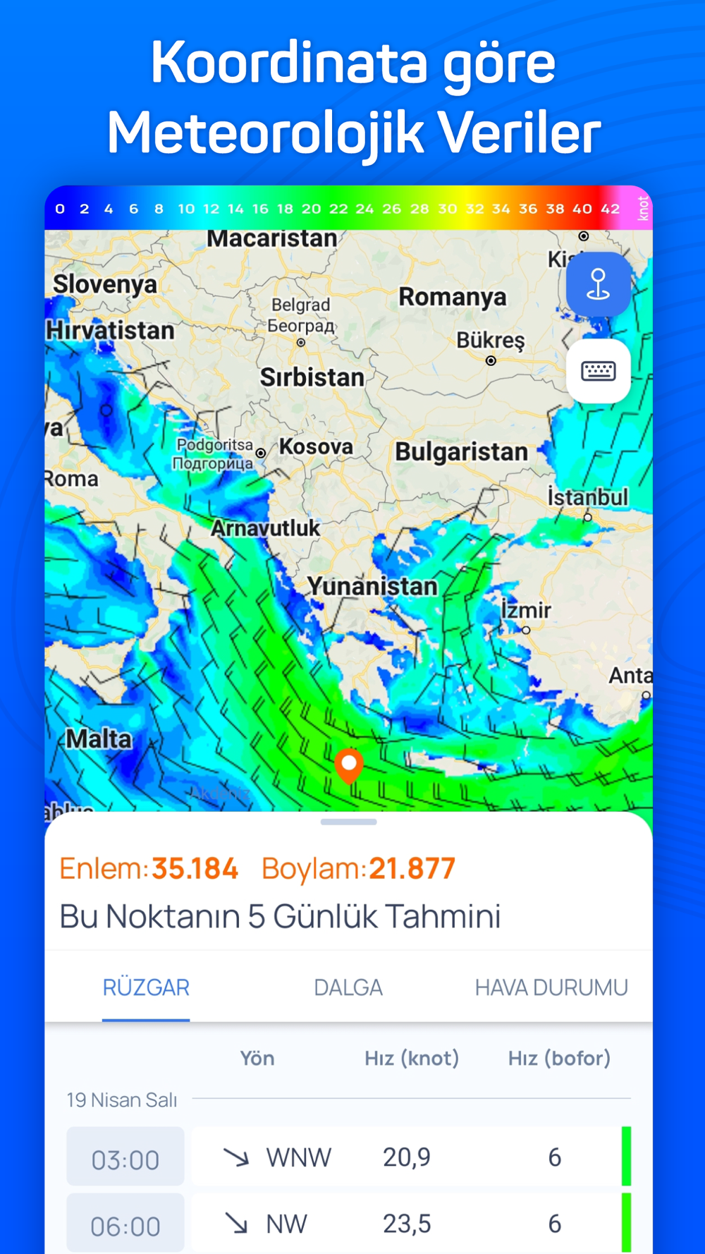 - Dinamik harita üzerinden, koordinat verilerini girerek, denizler üzerindeki saatlik Rüzgar Hızı / Yönü, Dalga Yüksekliği / Yönü, Dalga Periyodu verilerine ulaşabilirsiniz.