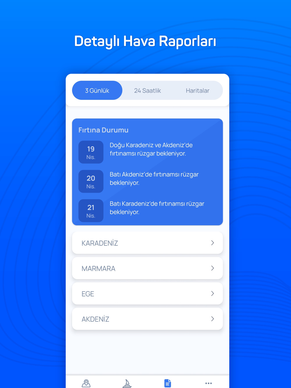 - Denizlerin, 3 günlük ve 24 saatlik fırtına durum uyarılarını ve detaylı hava raporlarını okuyabilirsiniz.