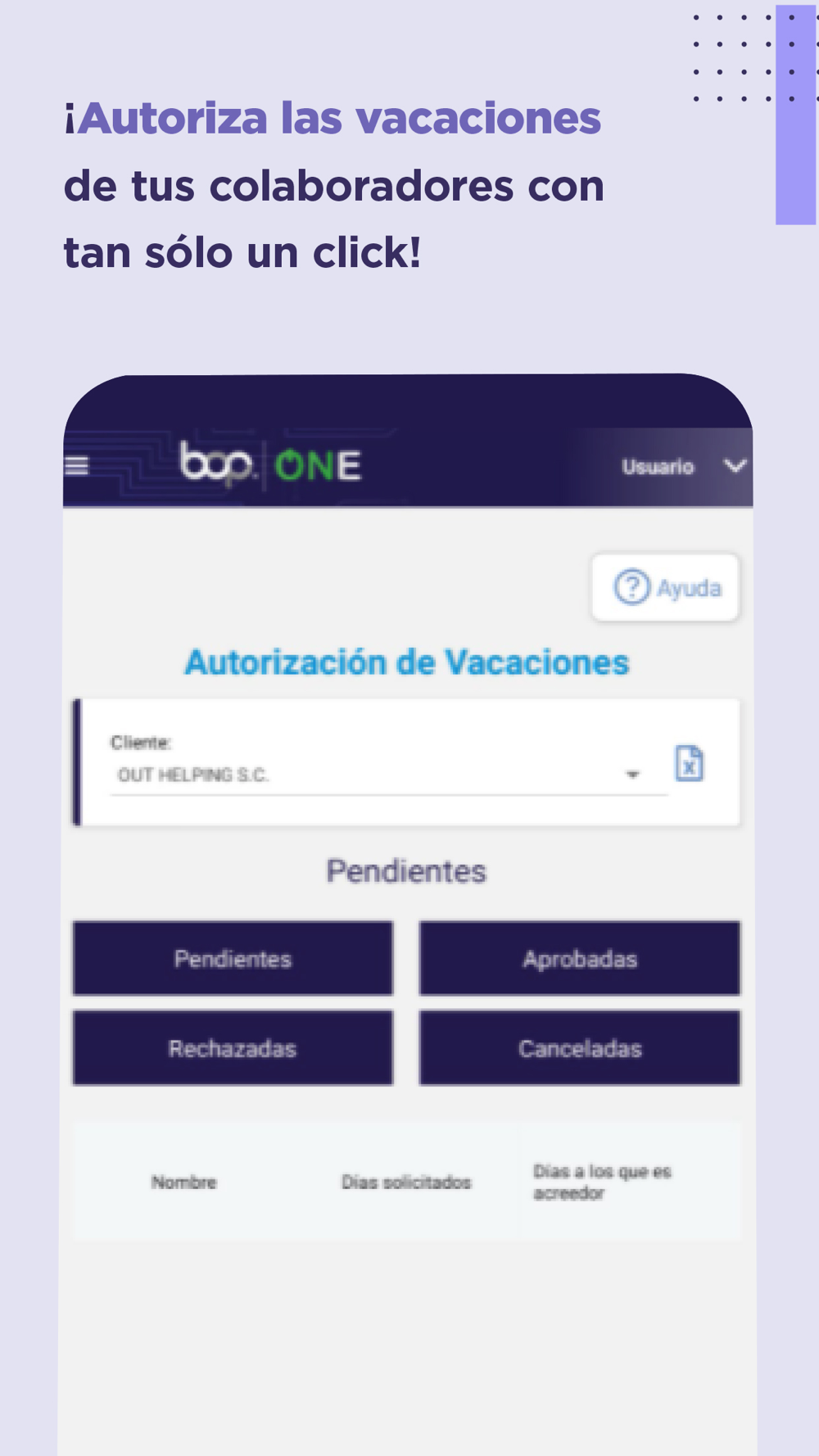 Nuestra App Móvil BOP ONE te apoyará en la administración de tu personal y gestión de solicitudes.