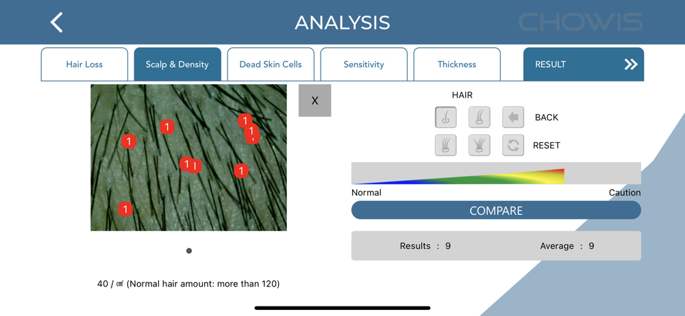 Chowis Hair is a modern hair analysis app that allows the capture of multiple hair images with accurate analysis for various hair parameters like hair scalp density, hair loss, hair thickness, keratin, sensitivity. This modular app allows potential linking with other apps to create a seamless and complete integration. Chowis Hair provides great flexibility and usability to customers looking for a reliable analysis module as an additional component to their existing applications.