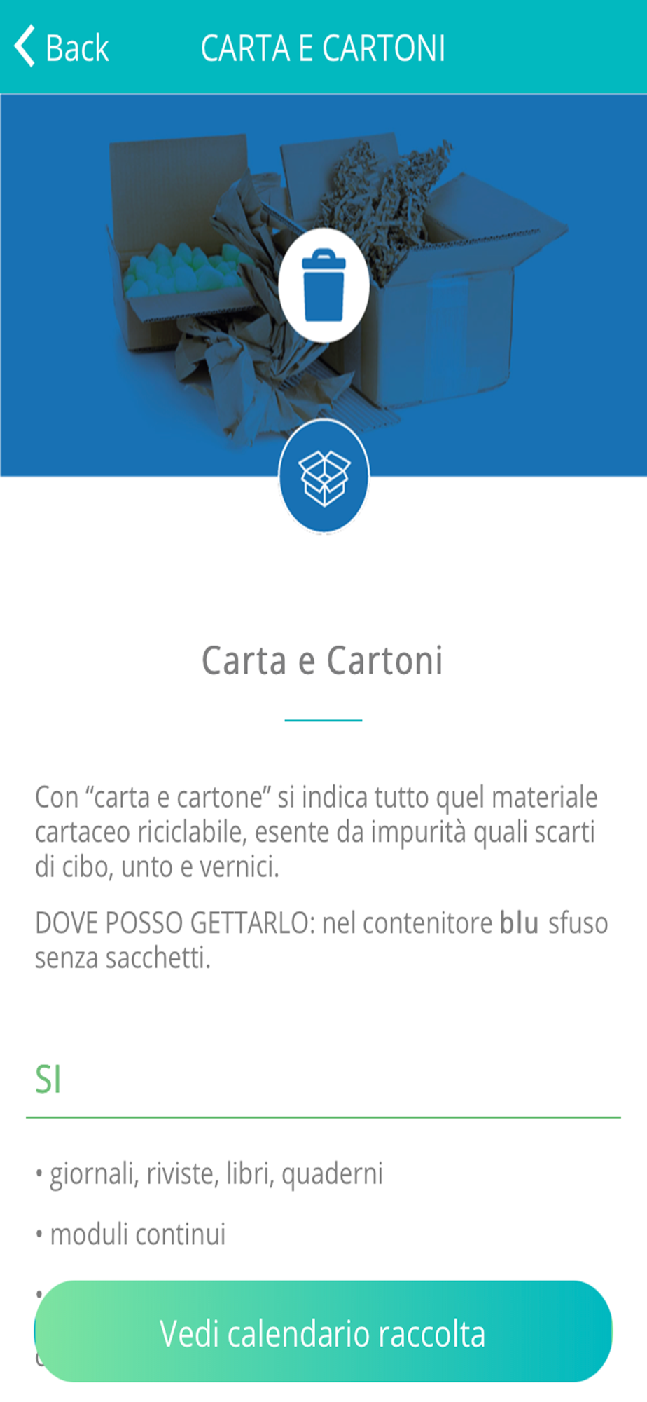 L’app offre all’utente una serie di funzionalità attraverso cui è possibile conoscere ed approfondire le modalità di conferimento dei rifiuti, ma è anche strumento utile per inviare segnalazioni e richieste di ritiro a domicilio, conoscere gli orari e i giorni di apertura del Centro di Raccolta, personalizzare le notifiche e tante altre funzioni.
