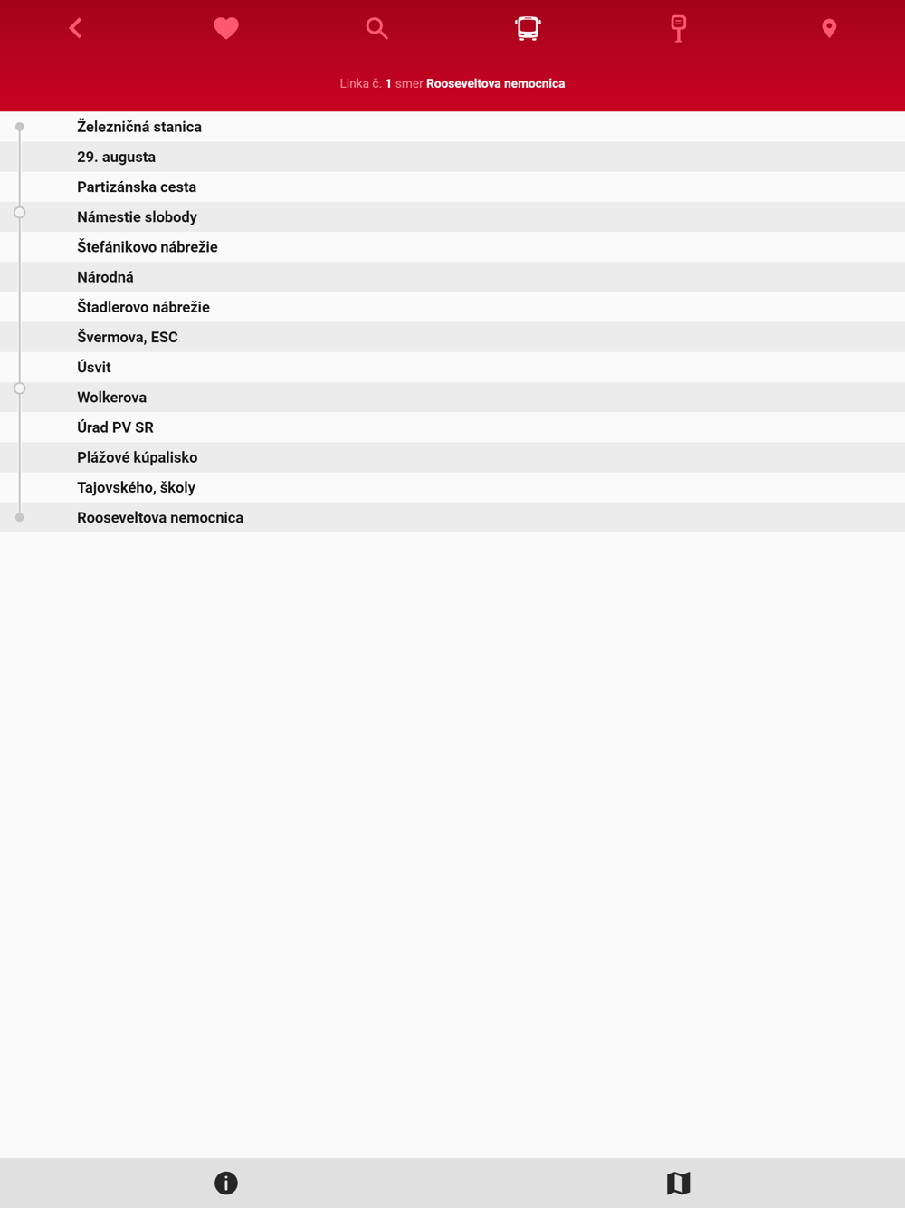 Ulož si obľúbený Bus alebo obľúbenú Zastávku, z ktorej často cestuješ. Odpočet ti ukáže koľko ti ostáva do odchodov obľúbených busov. Ak zmeškáš, nevadí, odpočet začína znova pre nasledujúci spoj. Navyše ak nestíhaš, môžeš si kúpiť aj SMS lístok. O aktuálne cestovné poriadky sa aplikácia postará sama, preto ťa už nezaskočí žiadna zastávka s prelepeným oznamom ;) K dispozícii je aj zobrazenie polohy autobusov/trolejbusov, zastávok a trás liniek na mape. Aplikácia upozorní aj na prípadne výluky a oznamy dopravného podniku.