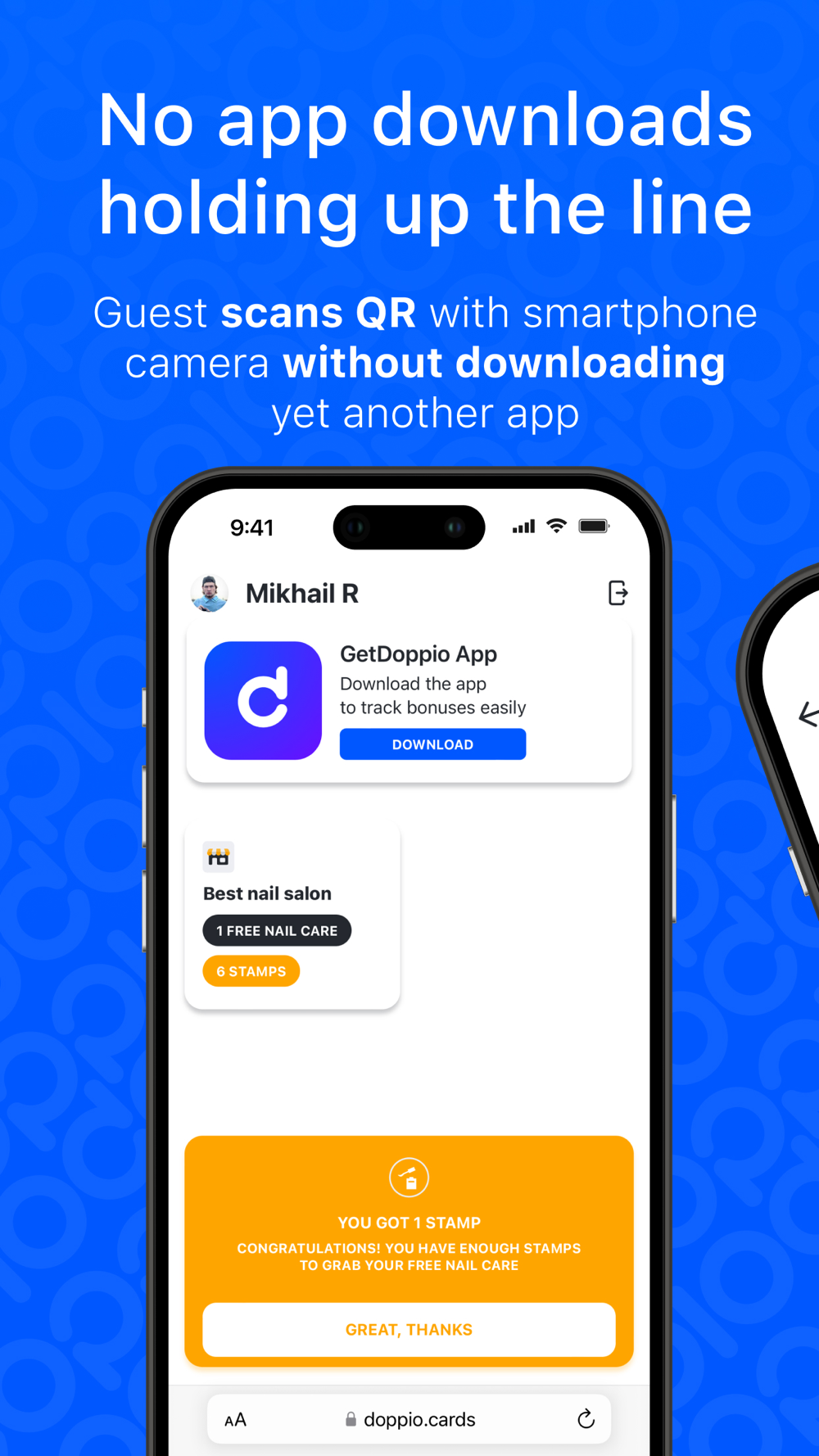 Simply use your phone or POS device to generate a doppio QR code, and have your guests scan this code to collect stamps. They don't need to download the app or register an account, as any web browser and smartphone camera will work. When a guest has enough stamps for a reward, they scan the reward QR code.