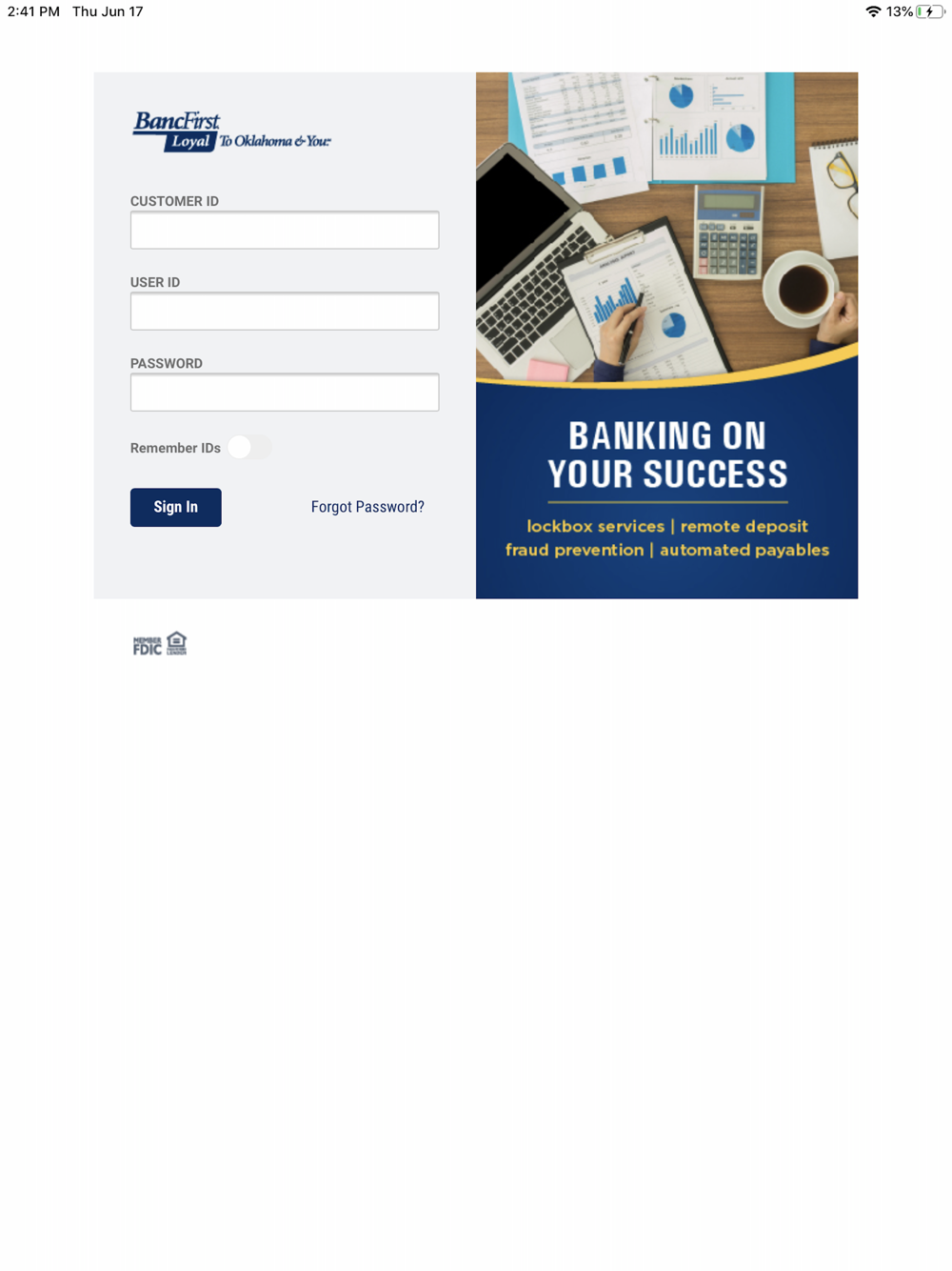 The BancFirst Business Mobile app is free, but web connectivity and usage rates may apply. To use BancFirst’s Business Mobile Banking you must first be enrolled and have logged on to BancFirst’s Business Online Banking with your PC. If you haven’t signed up for BancFirst’s Business Online Banking, contact your Treasury Management Officer at your nearest banking location for information regarding our Treasury Management services.