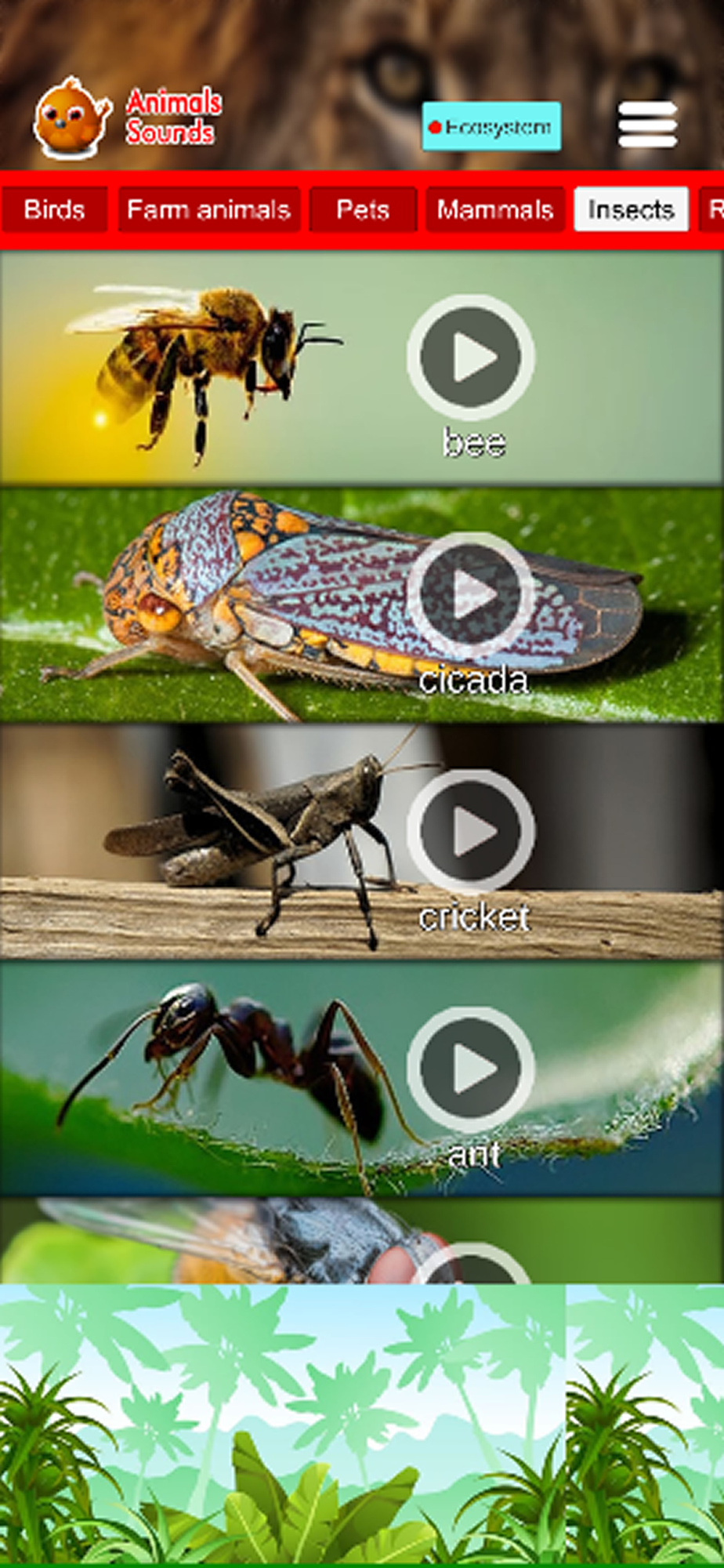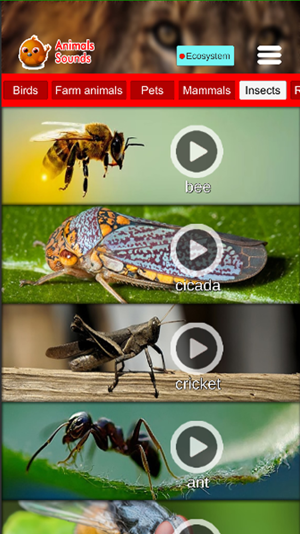 3. Insects: Bee, Cicada, Cricket, Ant, Fly, Grasshopper and more.