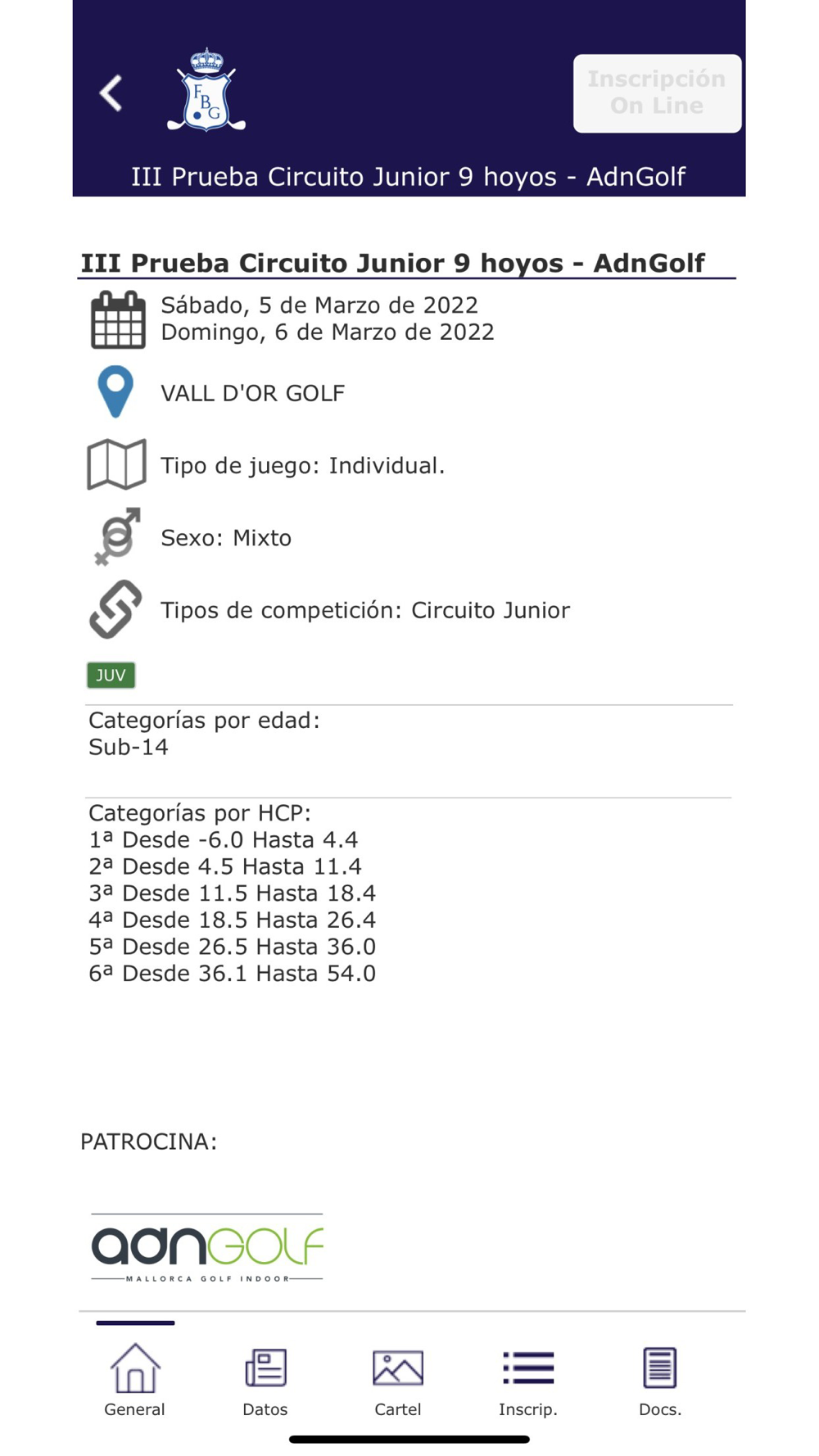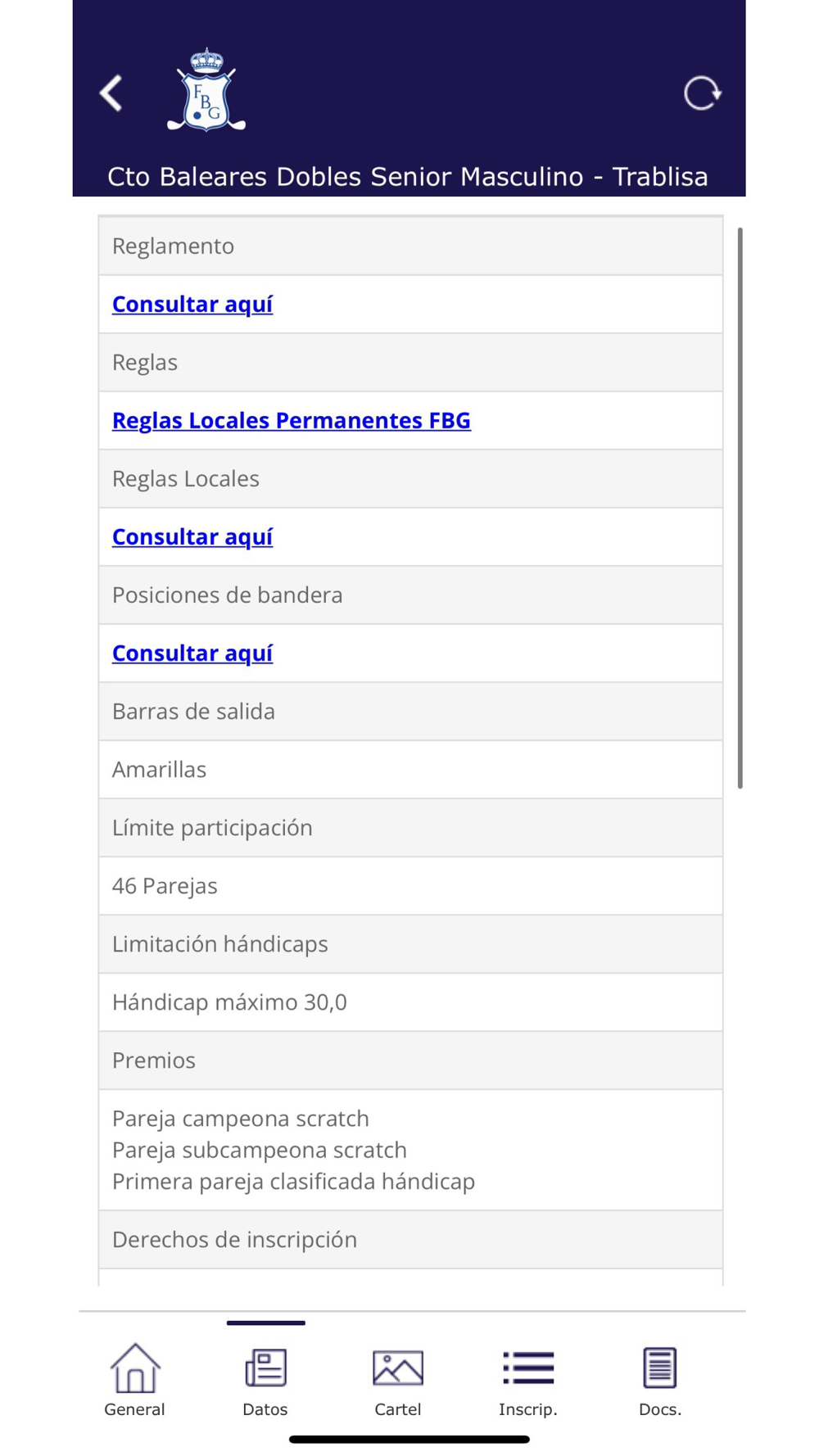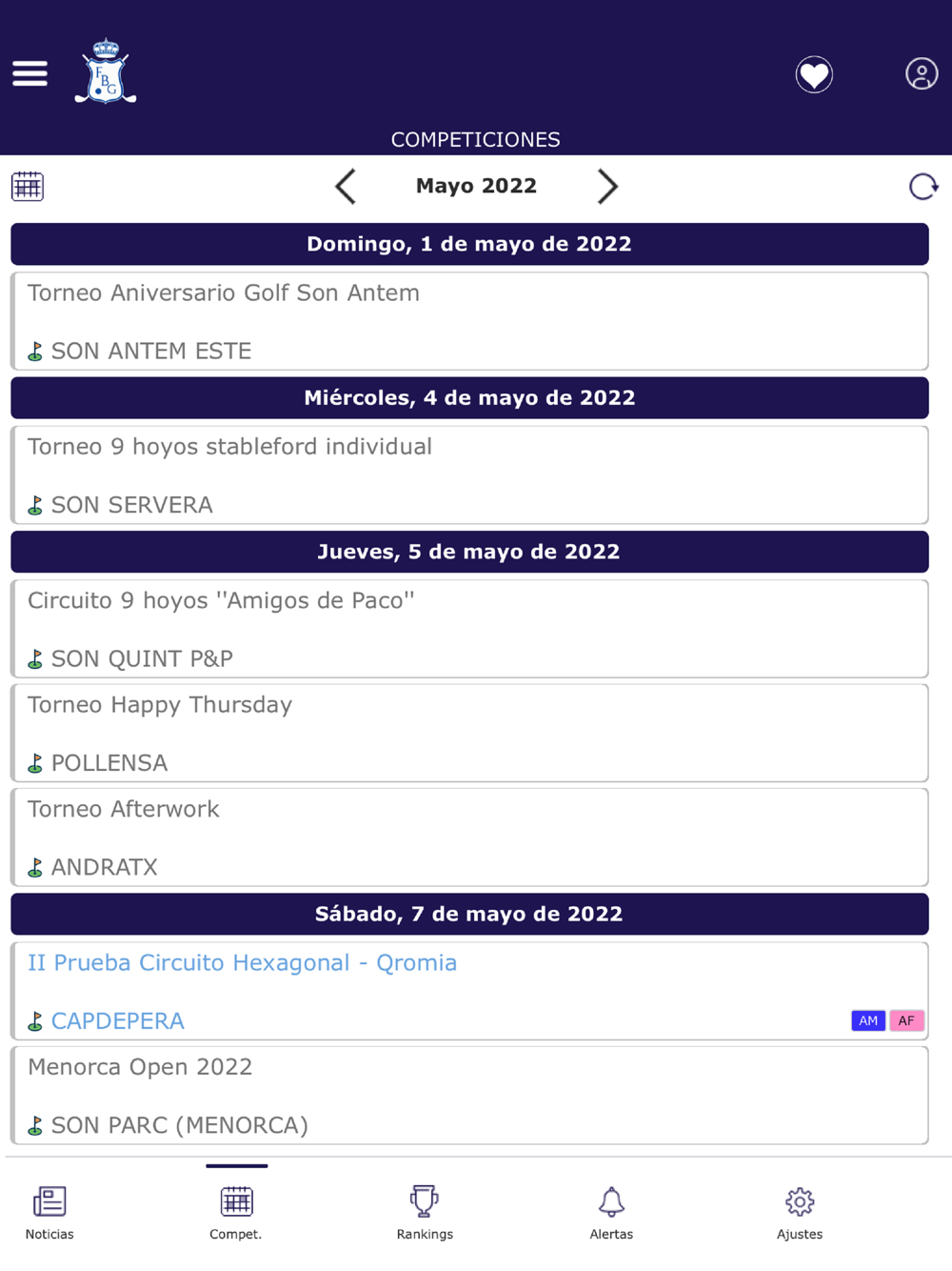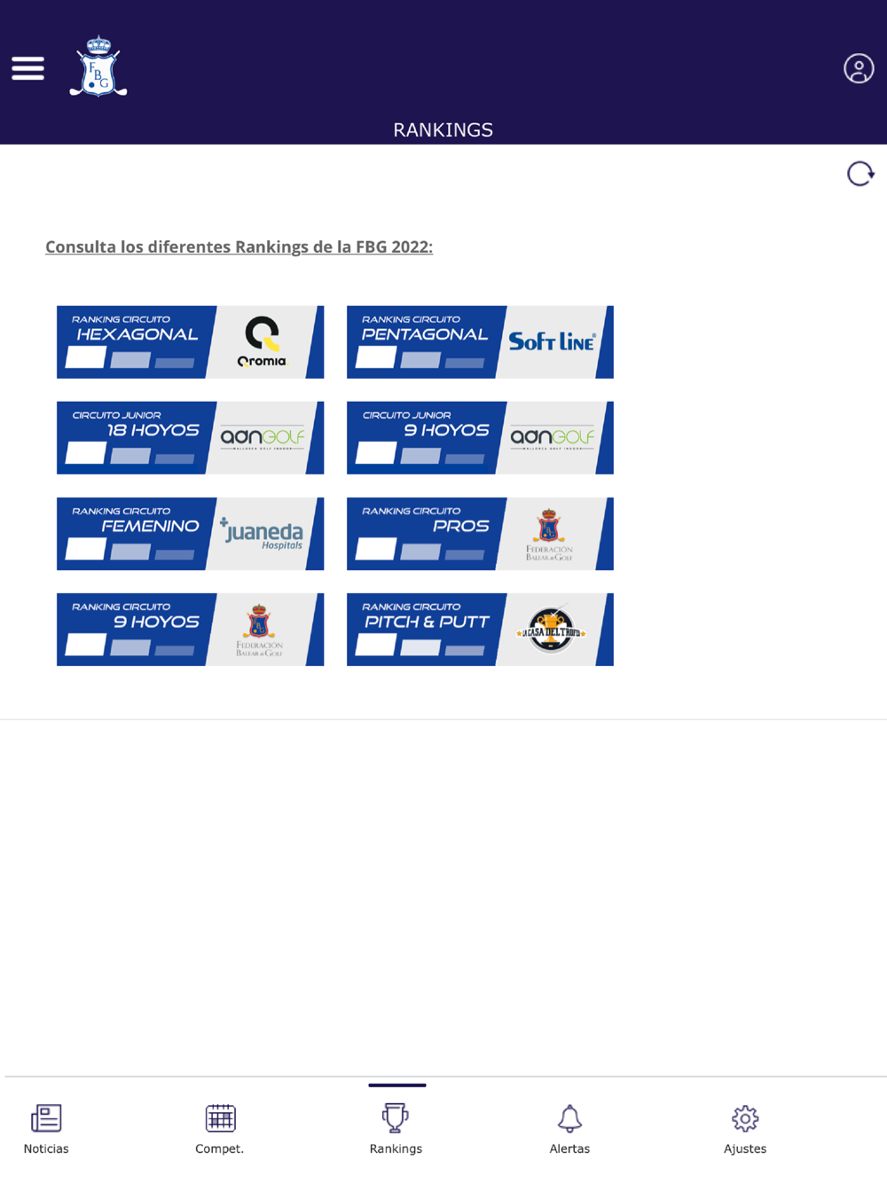 Con la APP de la Federación Balear de Golf podrás recibir alertas de competiciones y noticias, consultar todos los datos de nuestros Torneos oficiales e inscribirte online (inscripciones individuales, de parejas y equipos). Además, accede a tu ficha de actividad y con nuestro calendario mantente al día de todas las novedades del golf en las Islas Baleares.