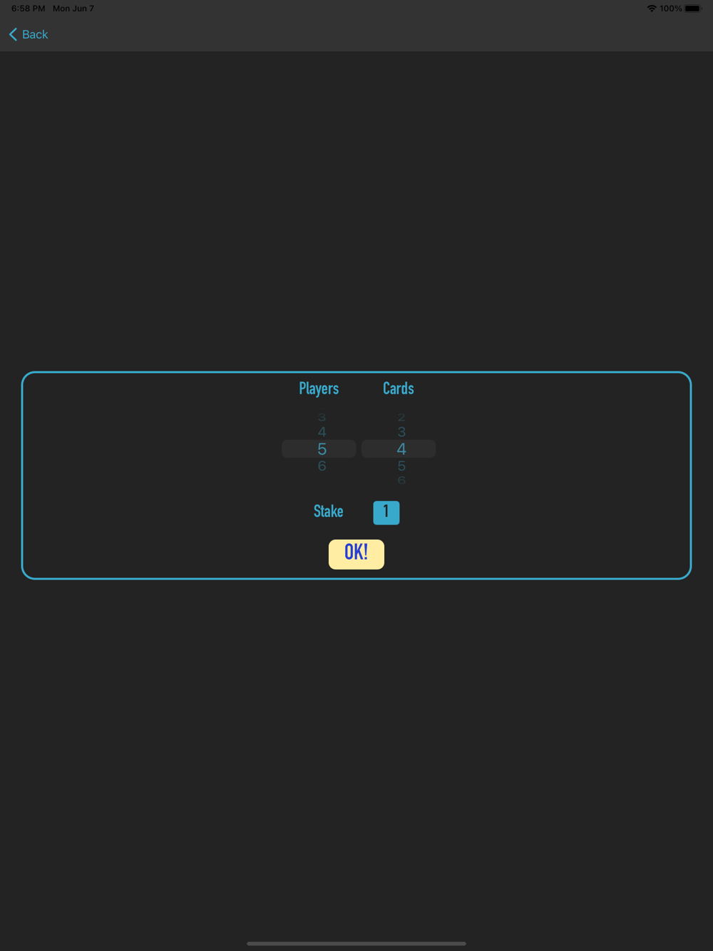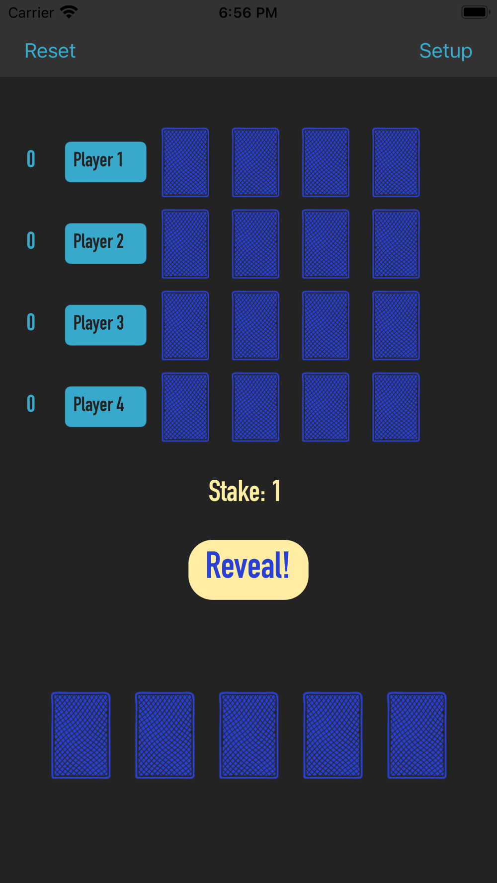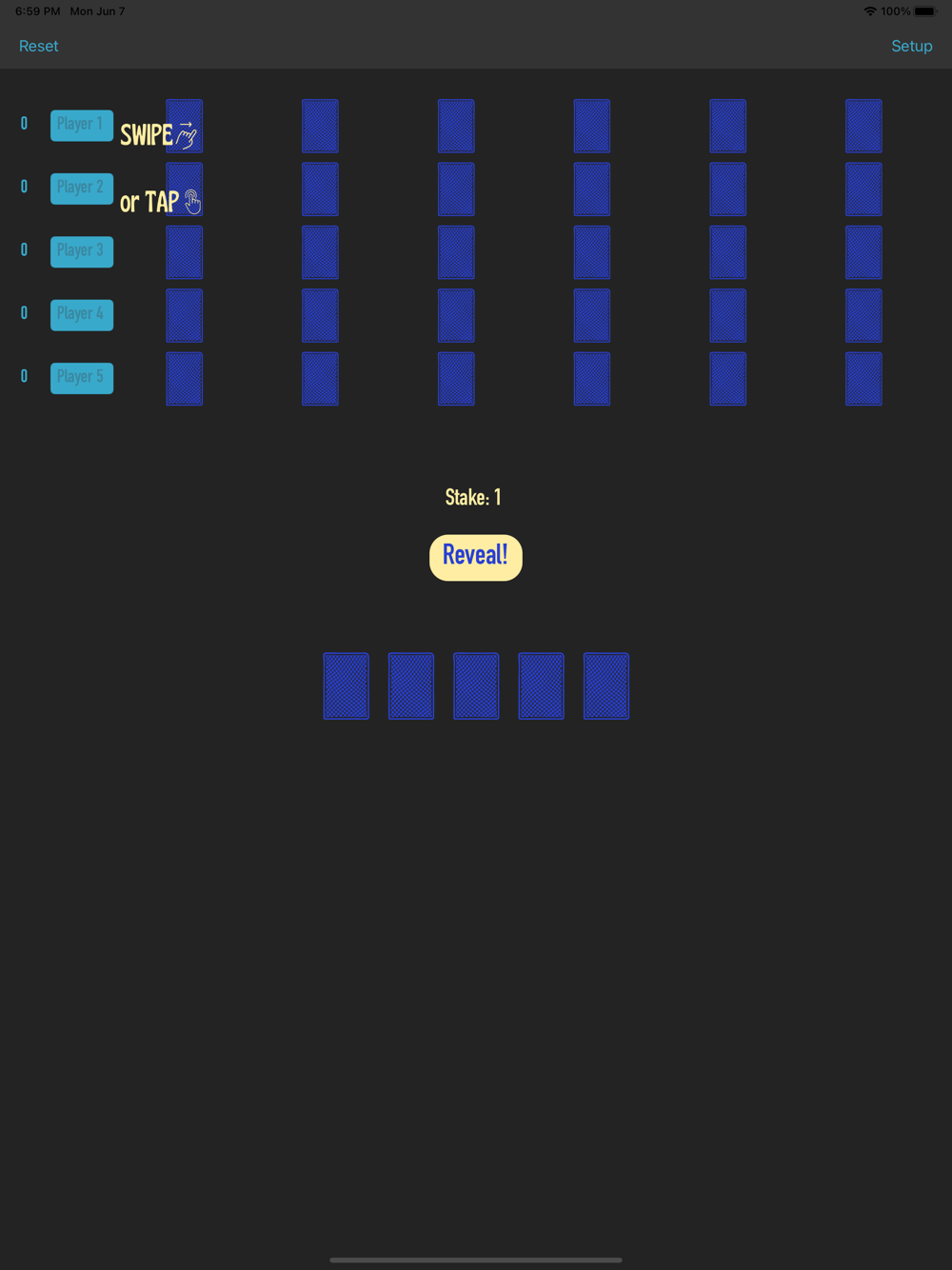 Choose a number of players and a number of cards, press deal and your good to go! Swipe to reveal your hand, or tap each card as you go for that extra sweat! This app will work out who's won and keep the score for you!