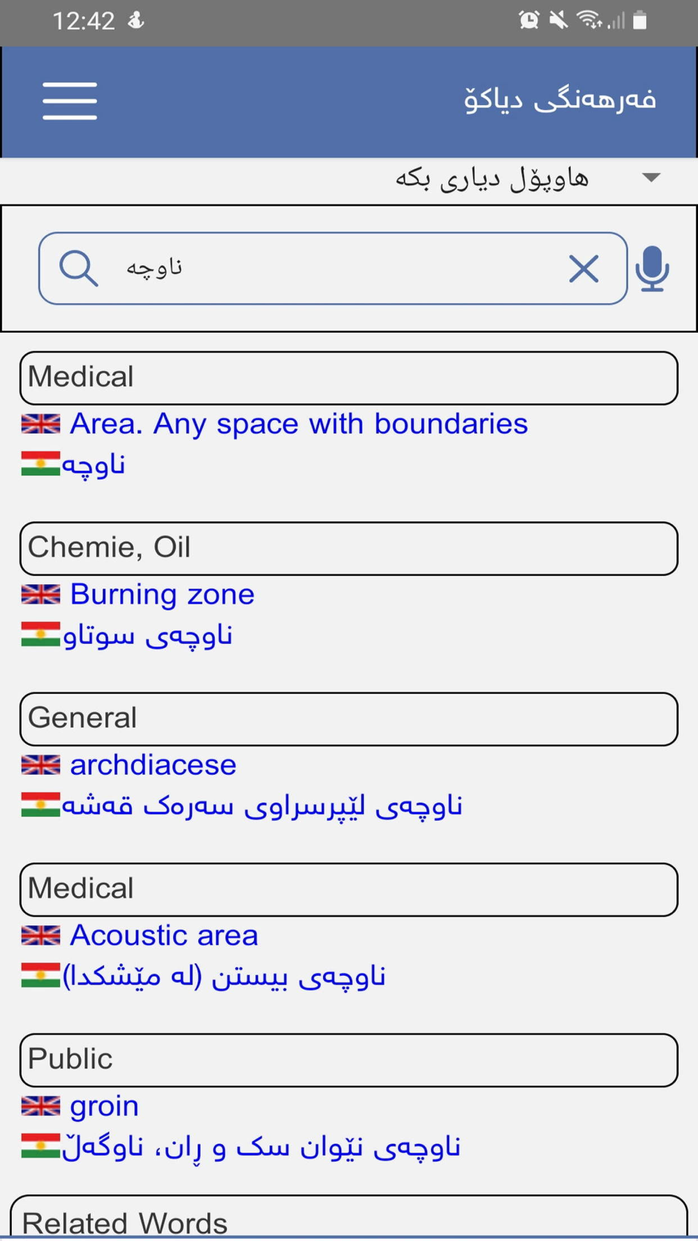 The App in its first version contains Kurdish (central) and English as based languages. The Languages Germn, Arabic, Persian and also Kurdish (northern branch) has limited words.