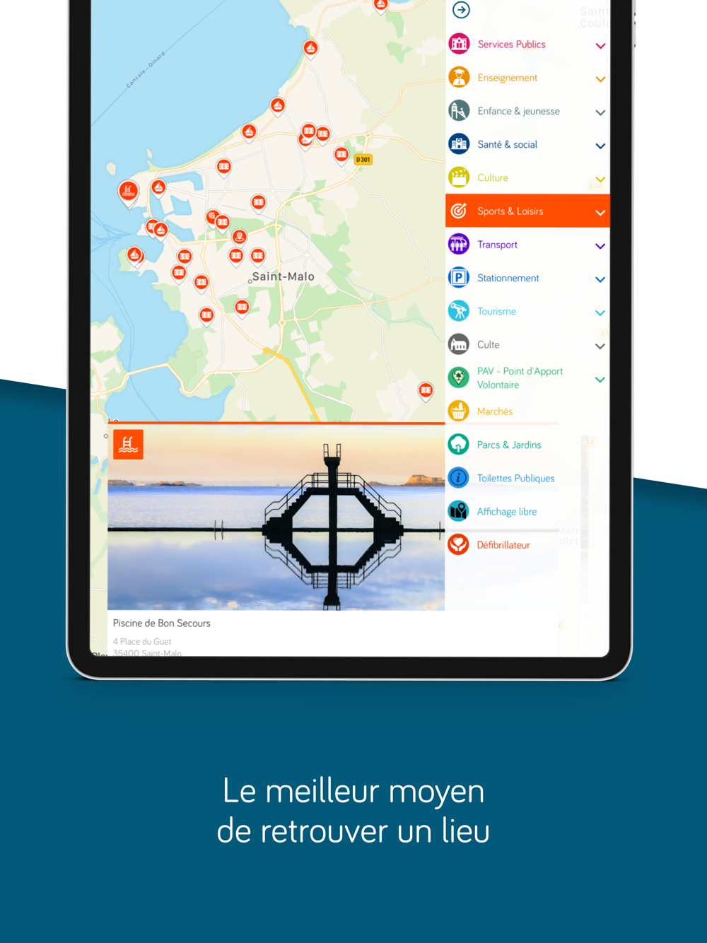 On peut consulter les actualités, accéder aux numéros d’urgence, aux horaires de marées, aux webcams, trouver la pharmacie de garde, le parking le plus proche, un emplacement PMR, ou encore la borne de recharge électrique pour votre véhicule la plus proche de votre position ou de votre destination, accéder aux séances de cinéma grâce aux liens partenaires…