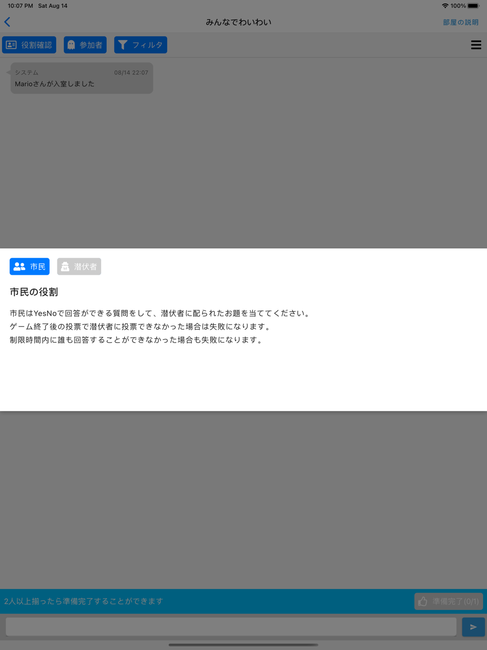潜伏者だと思う人に投票して、潜伏者に多数の投票が集まると、市民の勝ちになります。