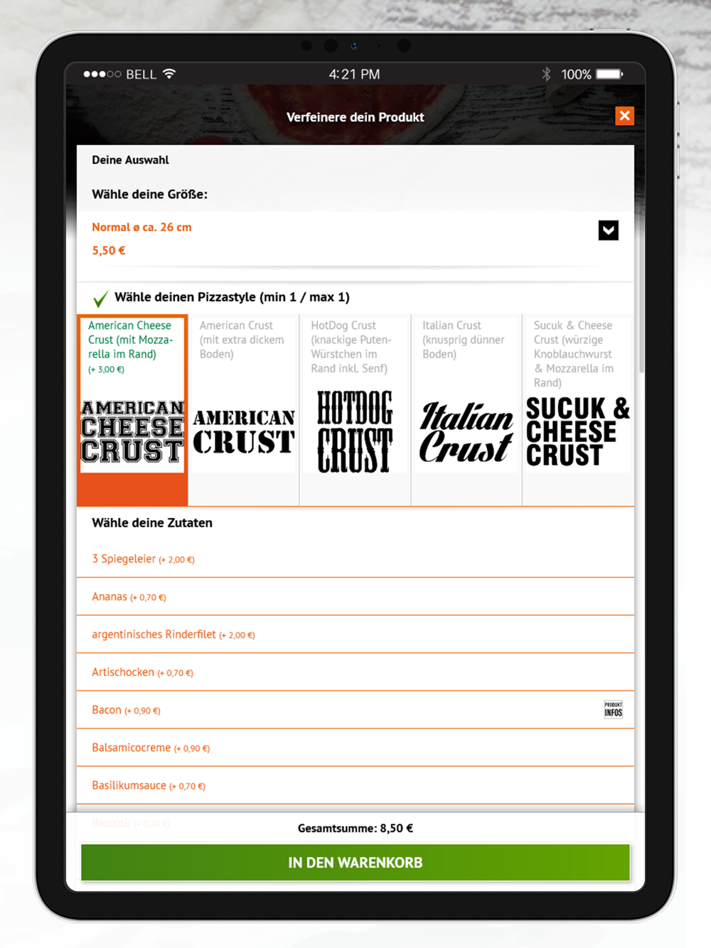 Entdecken Sie bei uns ein ganz neues Geschmackserlebnis mit sechs verschiedenen Rändern, fünf verschiedenen Saucen und über 30 Beläge.