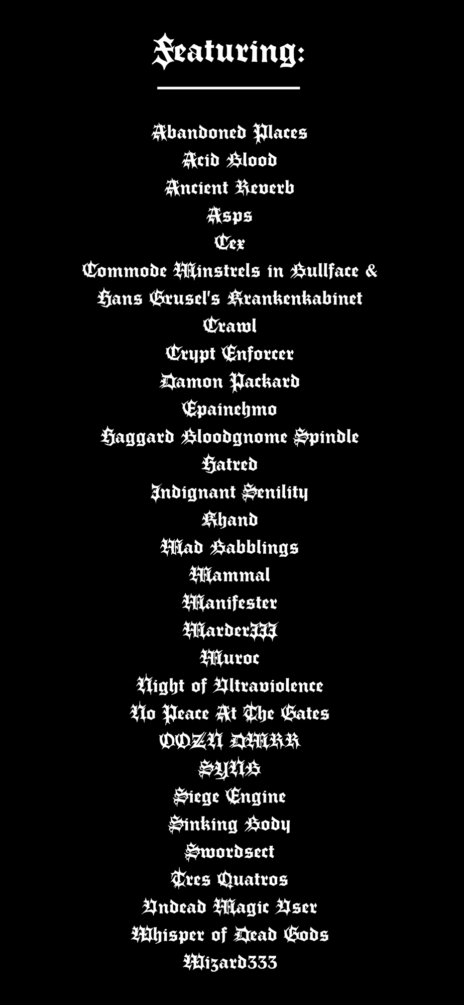 Abandoned Places, Acid Blood, Ancient Reverb, Asps, Cex, Commode Minstrels in Bullface & Hans Grusel's Krankenkabinet, Crawl, Crypt Enforcer, Damon Packard,