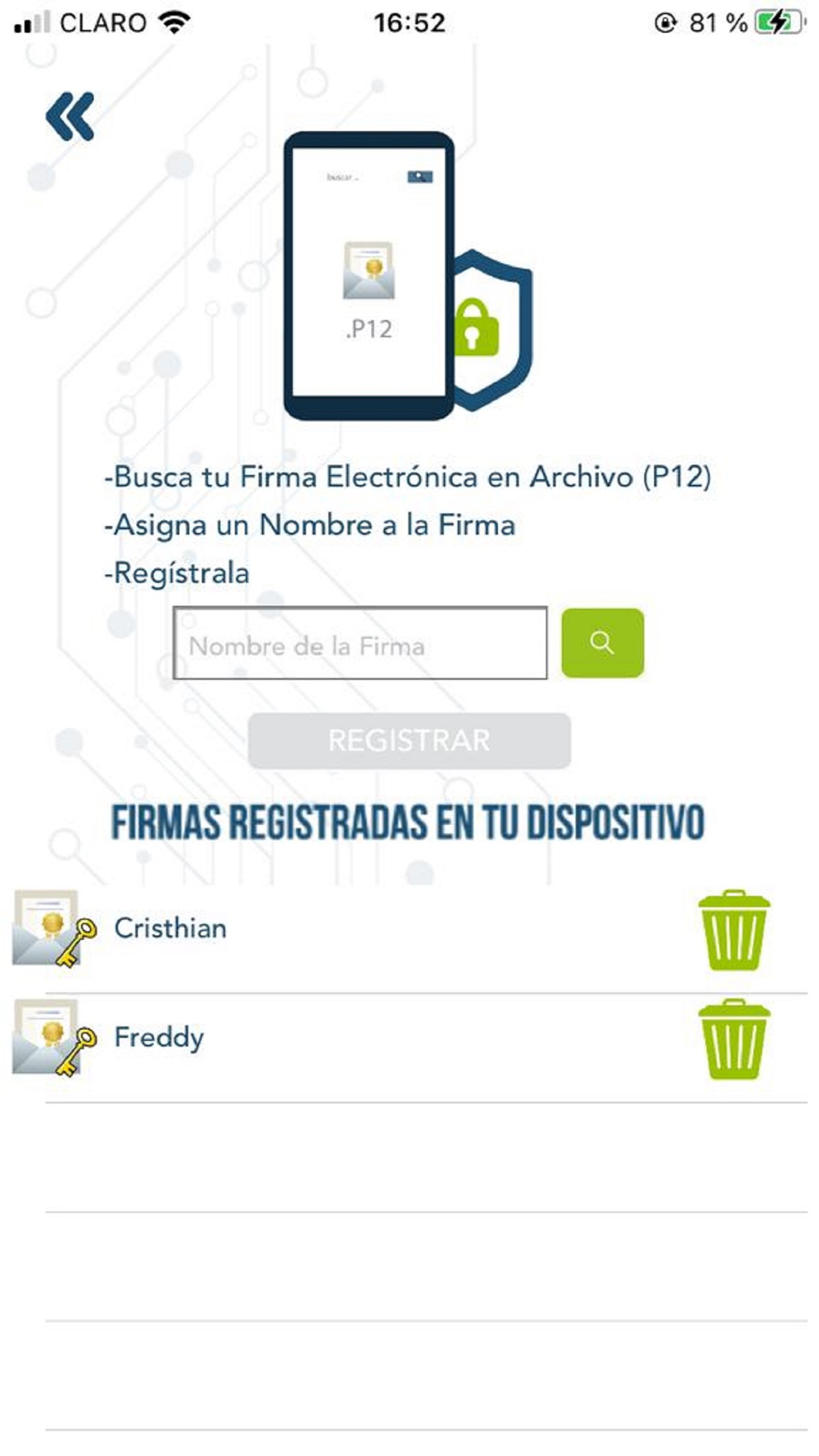 Firmador de documentos digitales, utilizando archivos de firma electrónica proporcionados por la entidad de certificación Security Data en Ecuador.