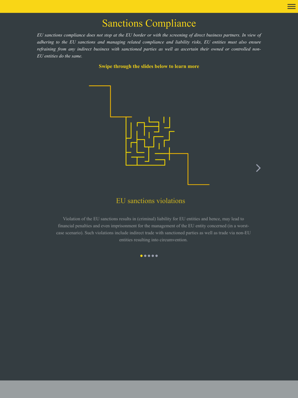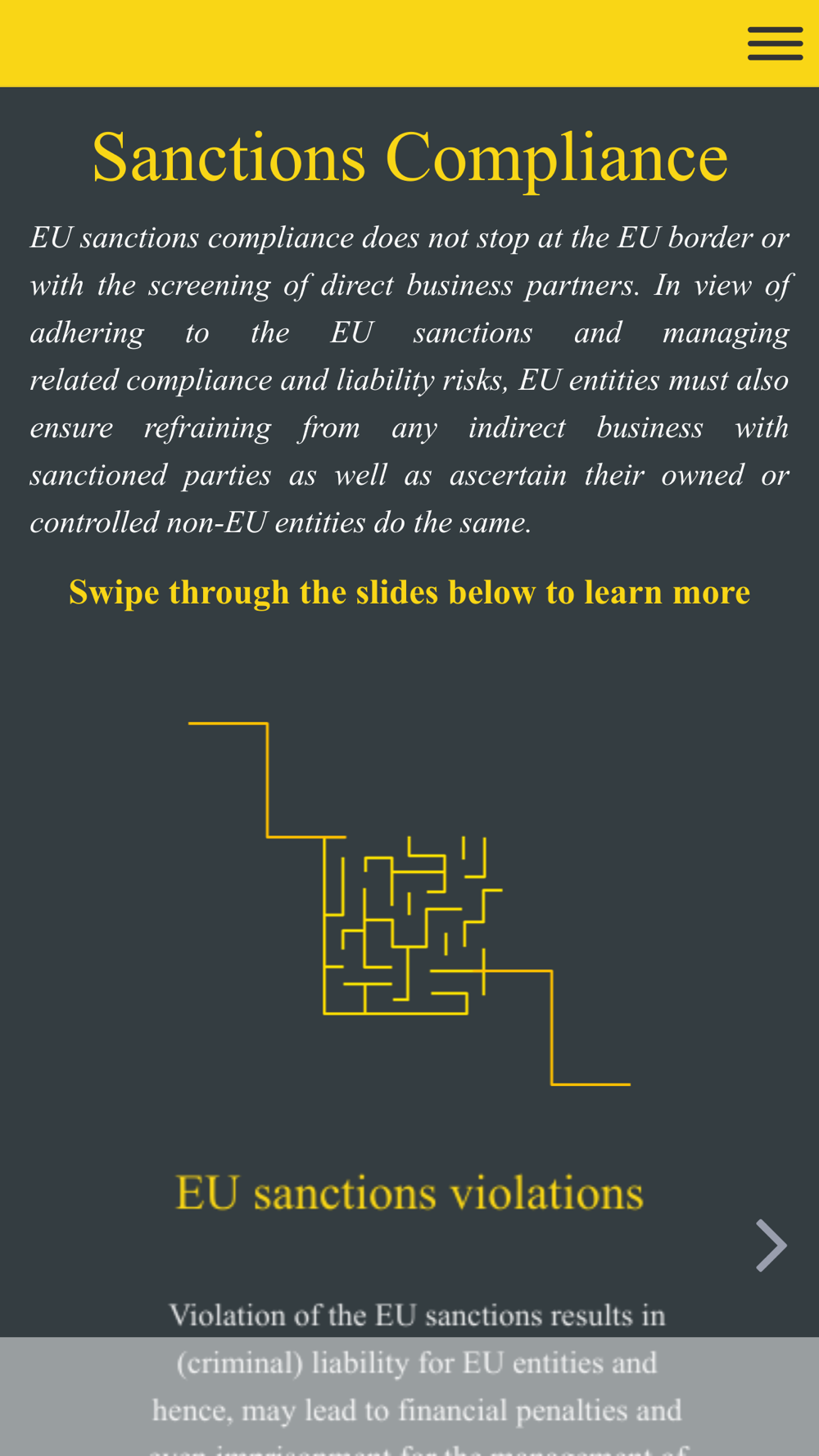 The SanctionsList App is designed as a quick and easy sanctions screening tool and consolidates the UN, EU, UK and US sanctions lists into one easy-to-use application. To start ensuring sanctions compliance and to check if your business partner appears on a sanctions list, insert your business partner’s name in the search bar of the SanctionsList App.