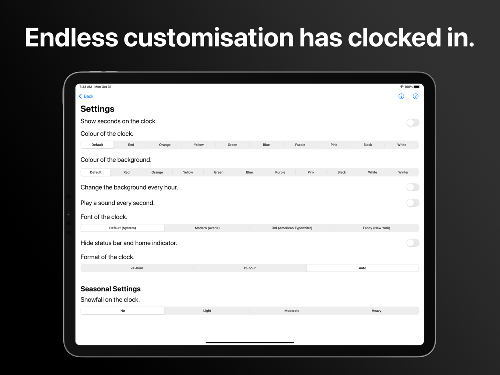 Moment In Time feels right at home on your Mac, with a design that fits right in with the rest of your computer. You can take this design further with limitless customisation, allowing you to change the app's font, clock colour, background, clock size, and a lot more so you can build your own Moment In Time.