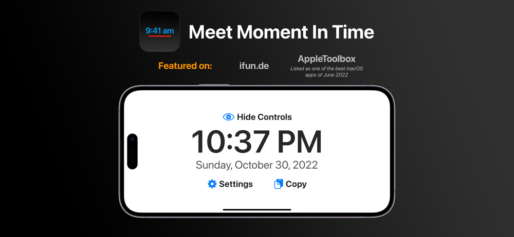 Moment In Time is completely & permanently free so you can give it a try with no strings attached. Your new clock is available across all of your devices; from your iPhone, iPad, Apple TV, to right here on your Mac. It does not contain ads or in-app purchases, and does not require an internet connection.