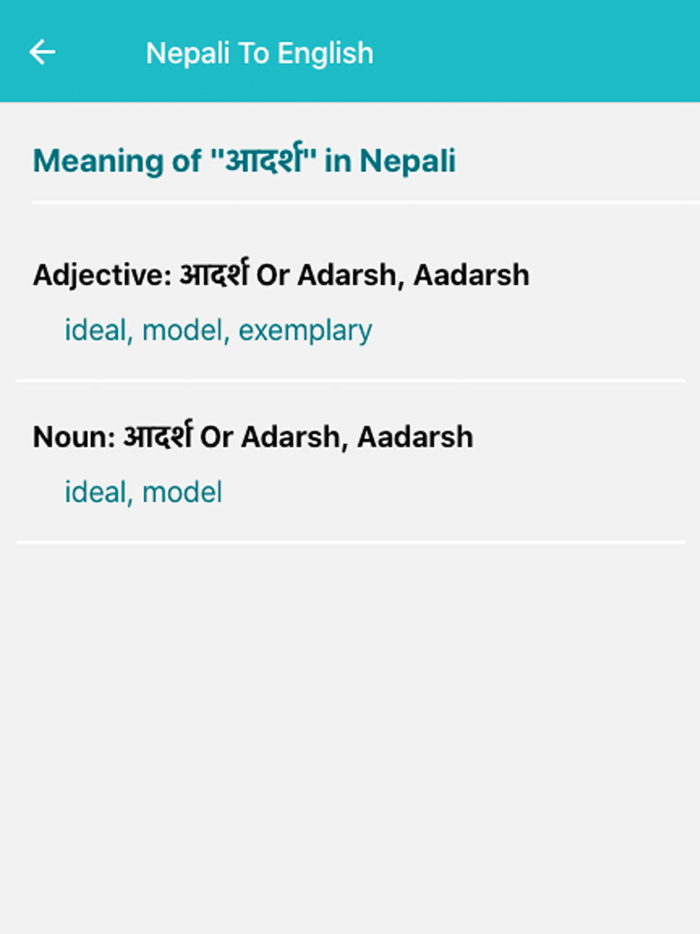 Roman Nepali to English and English to Nepali Dictionary app is a free offline and online dictionary. You will be able to search our 25K Nepali words and around 40K English word offline and new words added daily for online mode. You can switch between offline and online mode and search the meaning faster. This Free Nepali dictionary will help you to find the English meaning of the Nepali word. You only need to type in Nepali and you will get the English meaning.