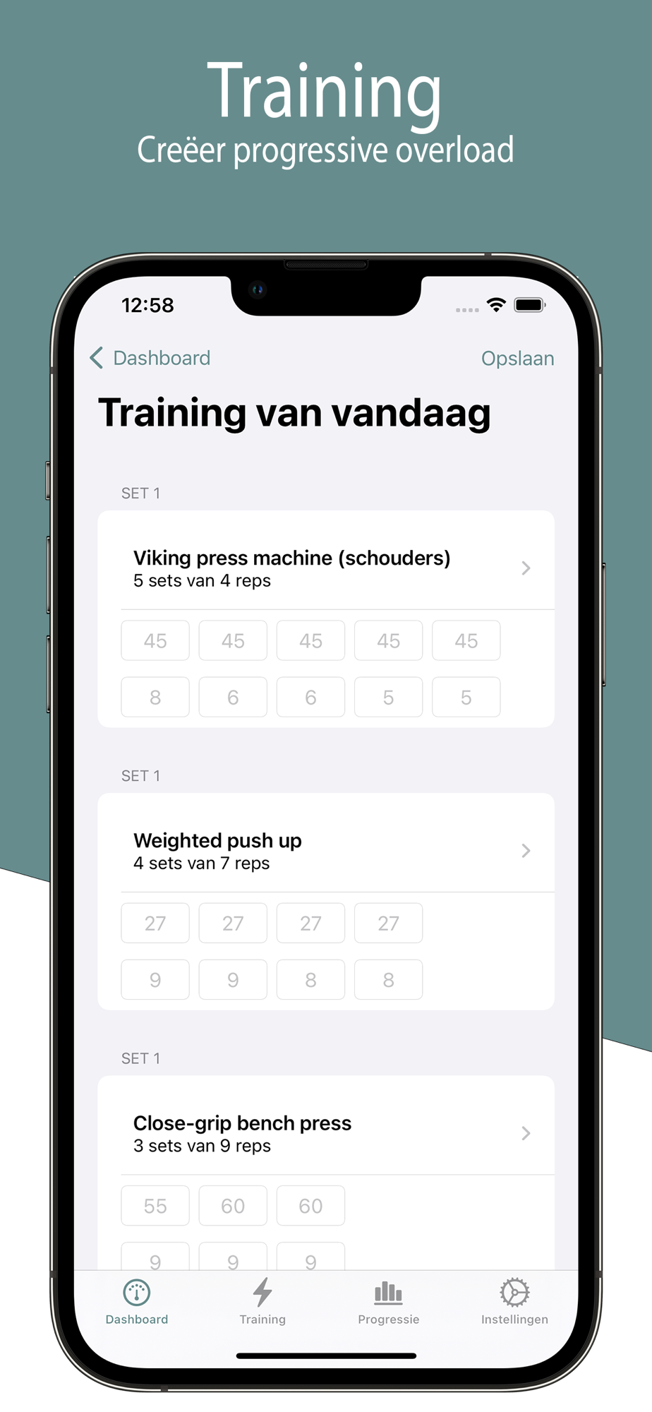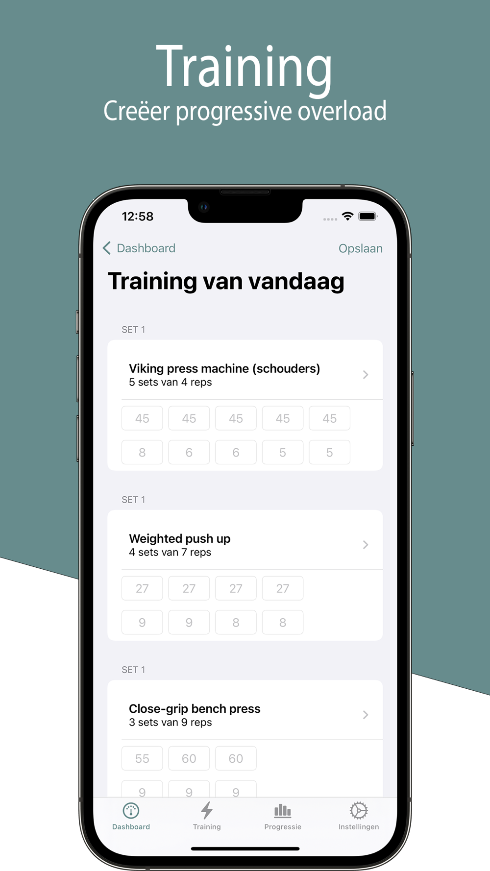 Natuurlijk is het mogelijk om je trainingen bij te houden. Maak je eigen trainingsschema en selecteer hem vervolgens in het menu. Wij maken het makkelijker om progressive overload toe te passen op je trainingen. In Track & Grow kun je namelijk de gewichten en aantal herhalingen bijhouden tijdens je training en zien wat je de vorige training hebt gedaan.