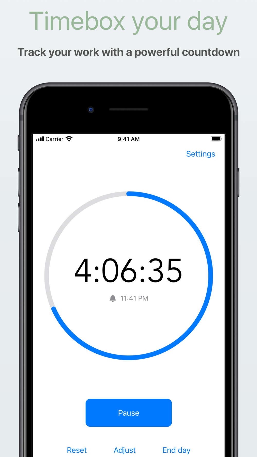 Each day you start with a timer that tracks the time you work. Pause to take a break and start counting down again when you're ready to get back at it, so you always know how much time you have left.