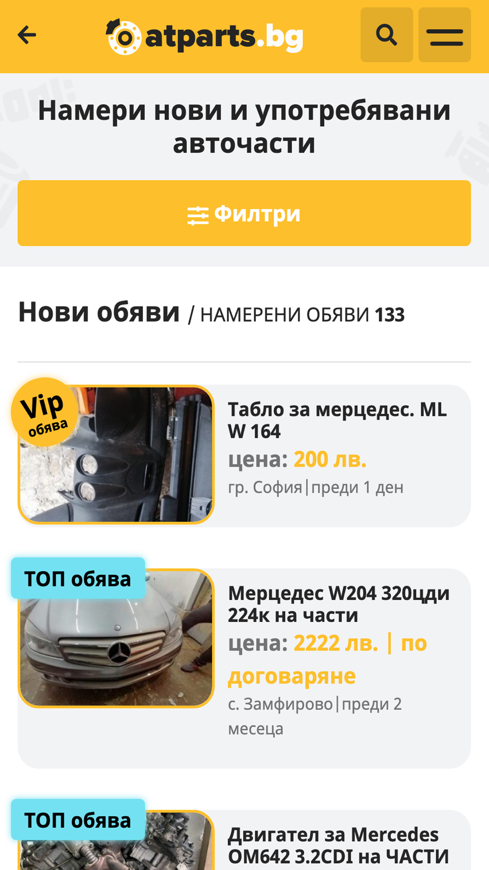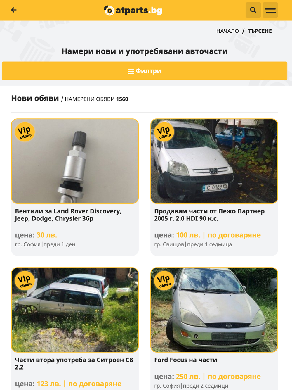 АТPARTS.BG е уеб сайт за електронни обяви от най-ново поколение, в който можете да откриете втора употреба автомобилни части от всички категории, подходящи за разнообразните марки и модели автомобили, камиони, бусове, мотори, селскостопанска и строителна техника.