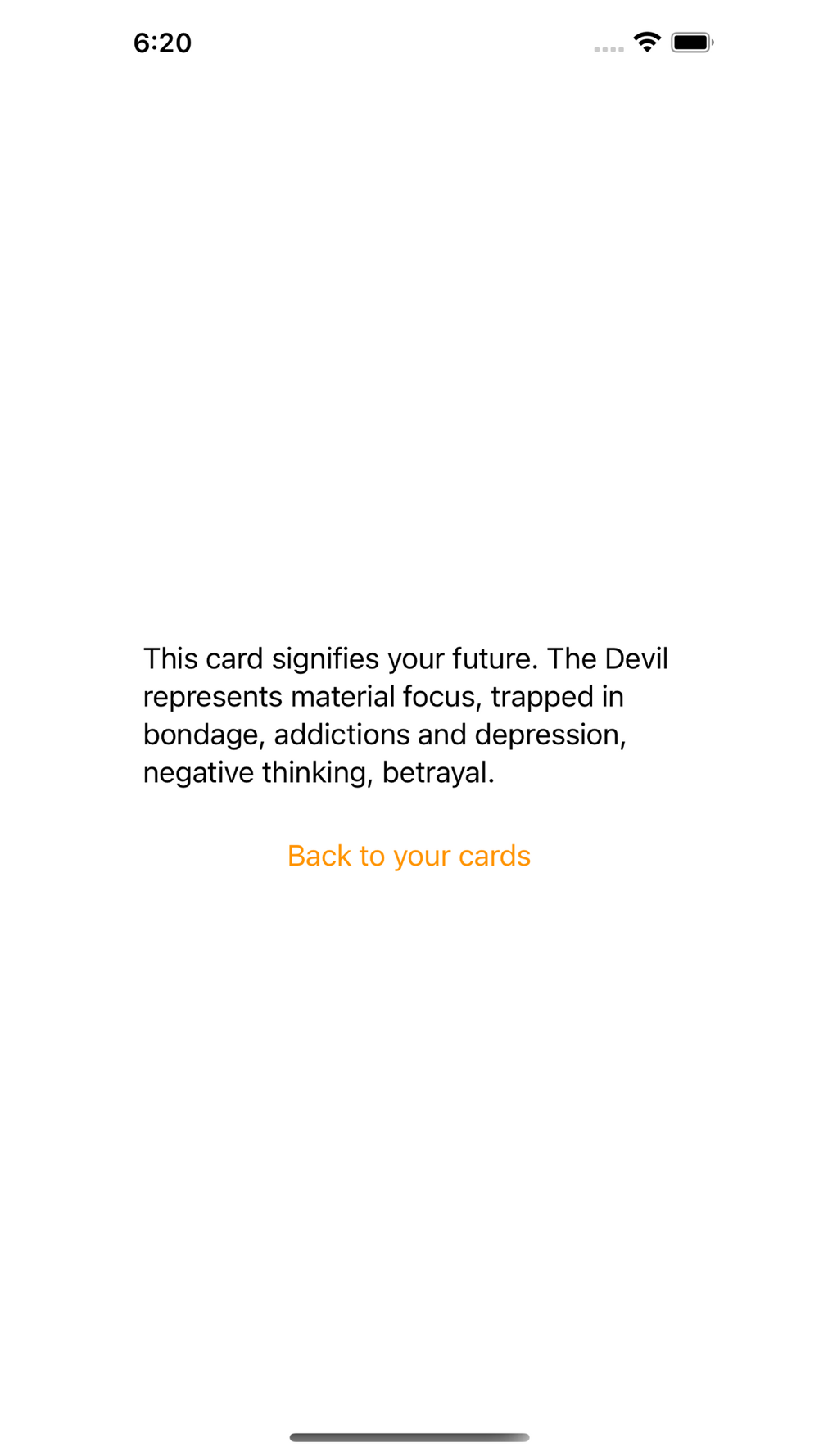 Shuffles a deck of Tarot Cards, giving you a reading of your present, past and future.