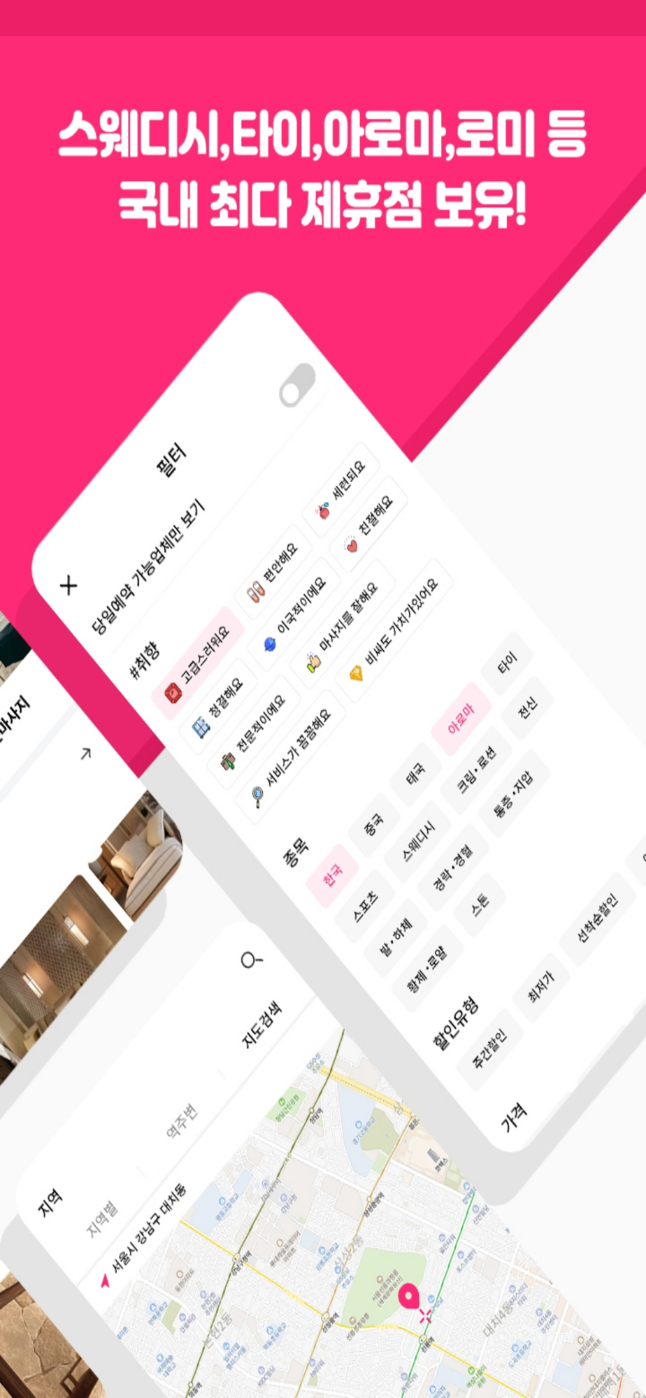 한국/중국/태국/베트남 마사지, 왁싱, 스파, 에스테틱, 스웨디시, 아로마, 타이, 스포츠, 로미로미, 경락/경혈, 발 마사지, 여성/남성 전용, 일본식 마사지 등