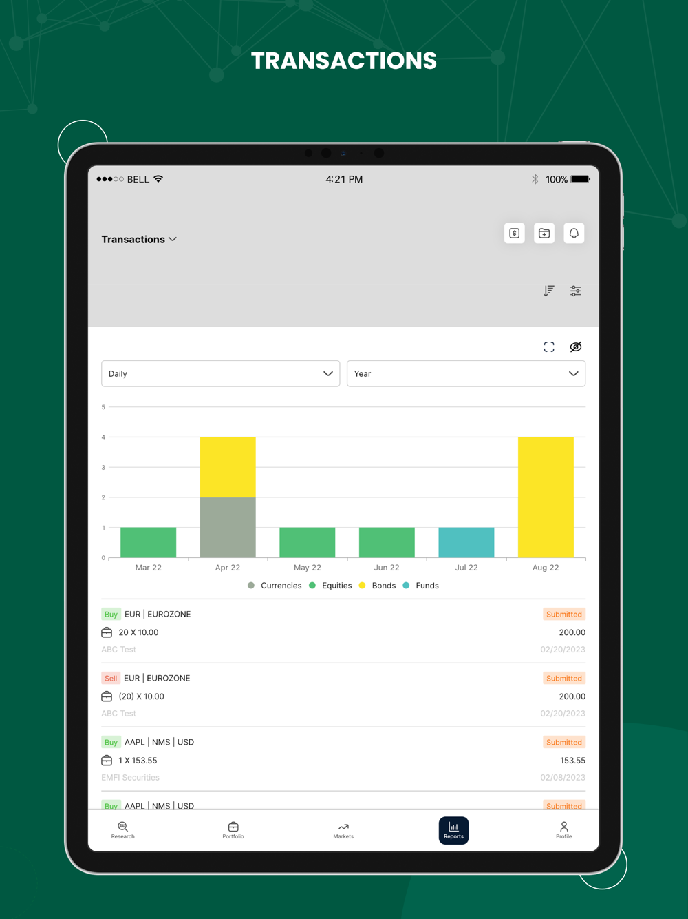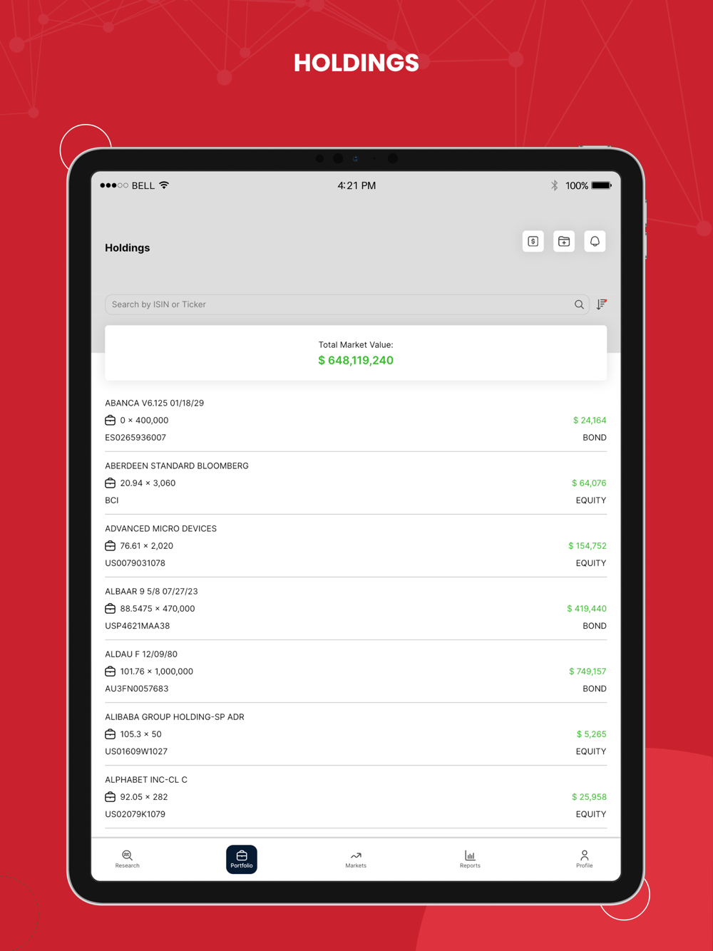The app provides financial data, analytics and research in addition to the ability to execute, settle and custody financial securities for professional investors.