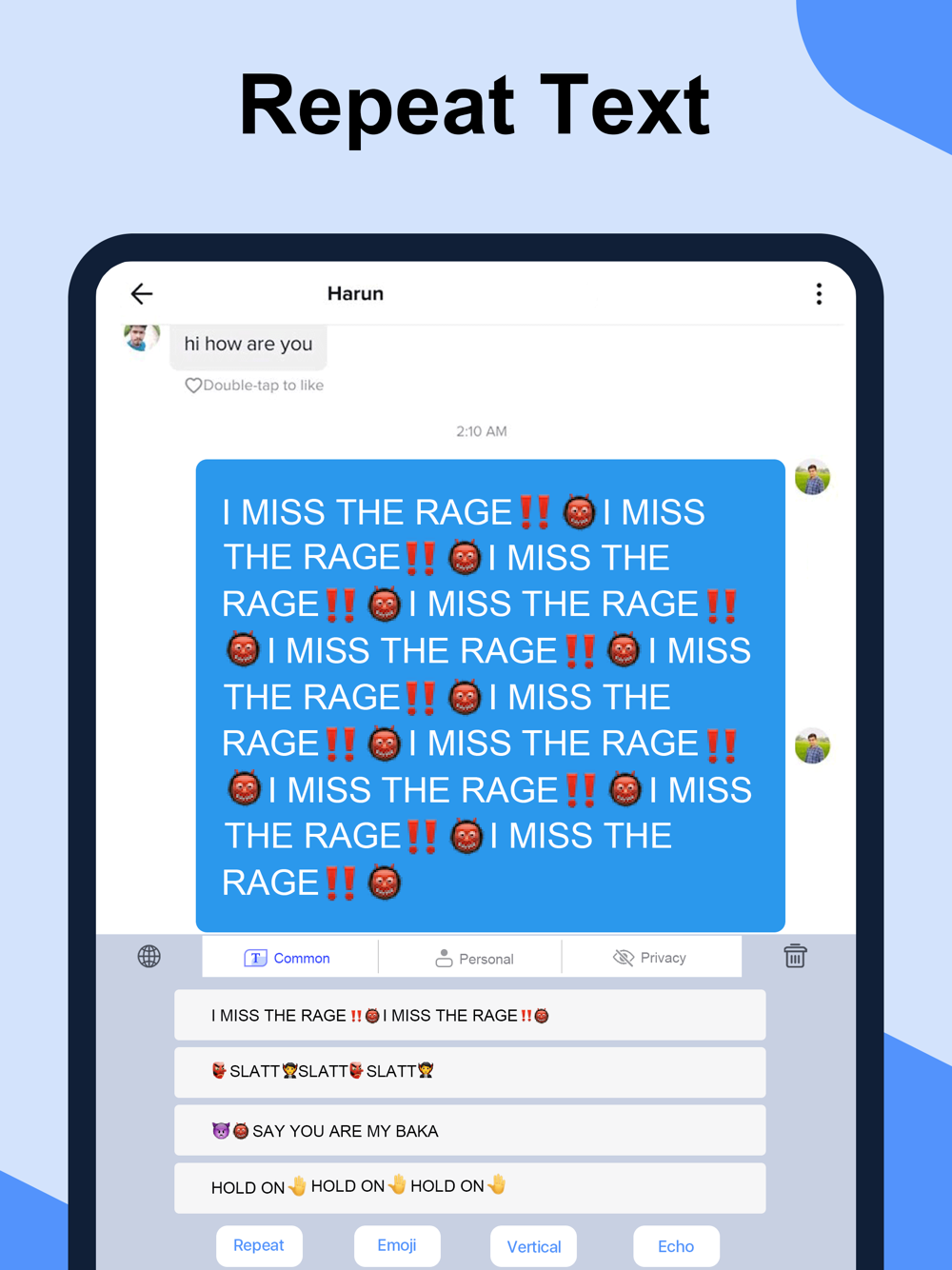 Copy and paste frequently used chat sentences and add them to the "common" list, with fancy input effects 【repeat/emoji/vertical/echo】, especially suitable for social scenes.