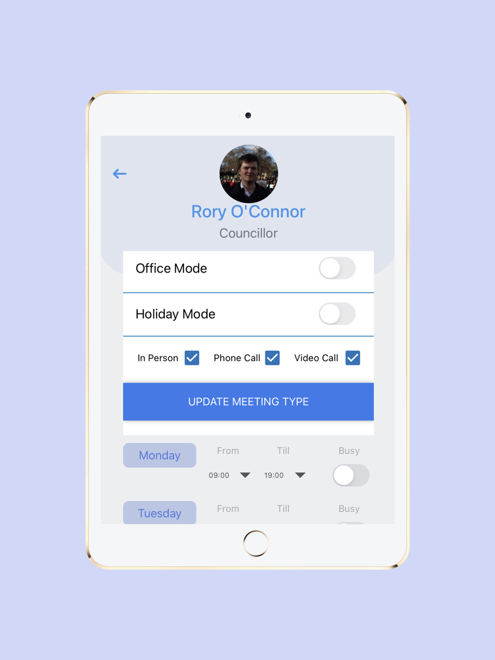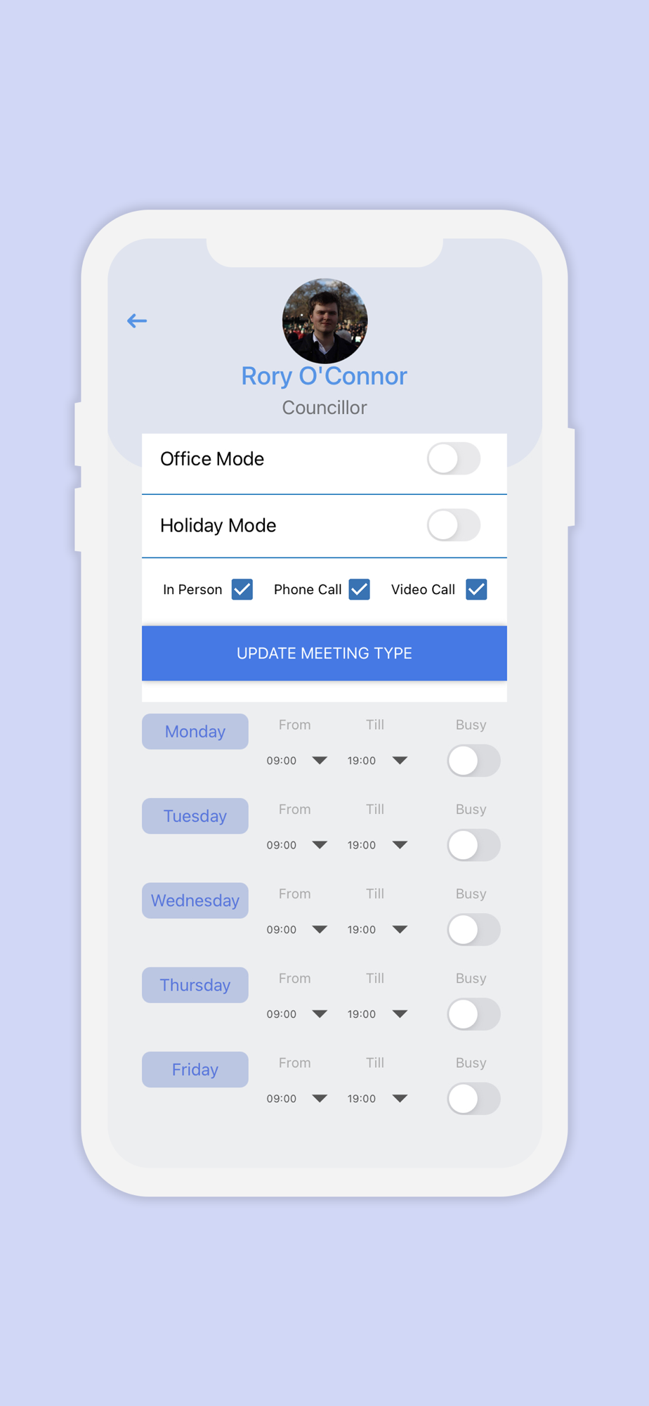 - Office mode: This allows you to pick a location to do clients for your constituents. You can set the time, date and location. This is Google maps integrated, making it easy for the user to find your location.