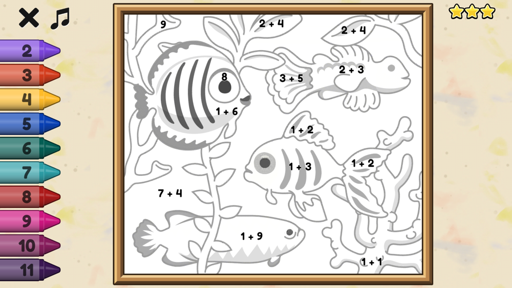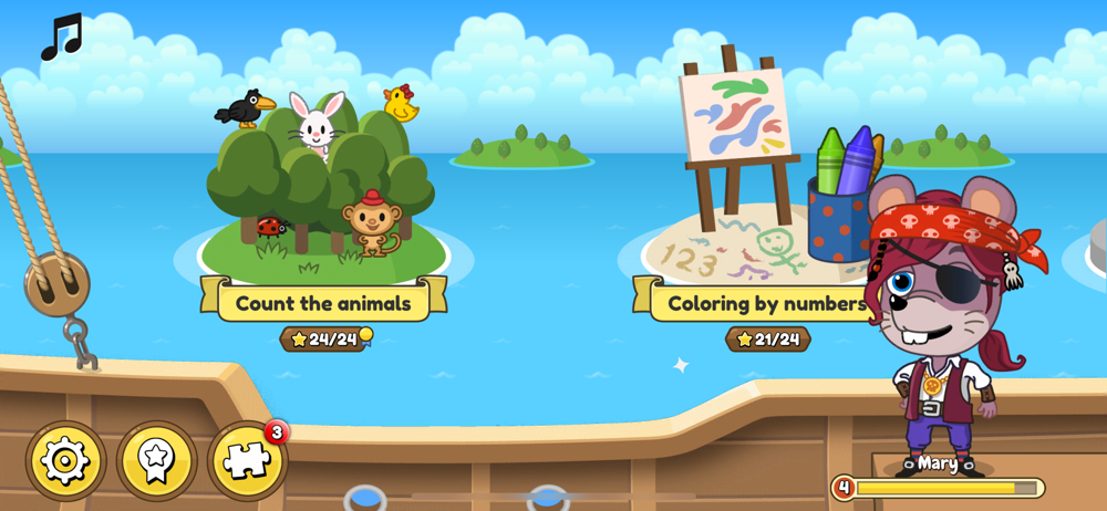 This educational math game contains activities and puzzles for grades K-3. The player chooses a character and travels from island to island to meet challenges such as counting animals in the woods, matching up number friends, drawing dot-to-dot, coloring by numbers, completing patterns and playing a memory matching game. Get stars and level up the character by completing the stages of the game. There are also medals and pieces of a jigsaw puzzle to collect as additional rewards and encouragement for the child.
