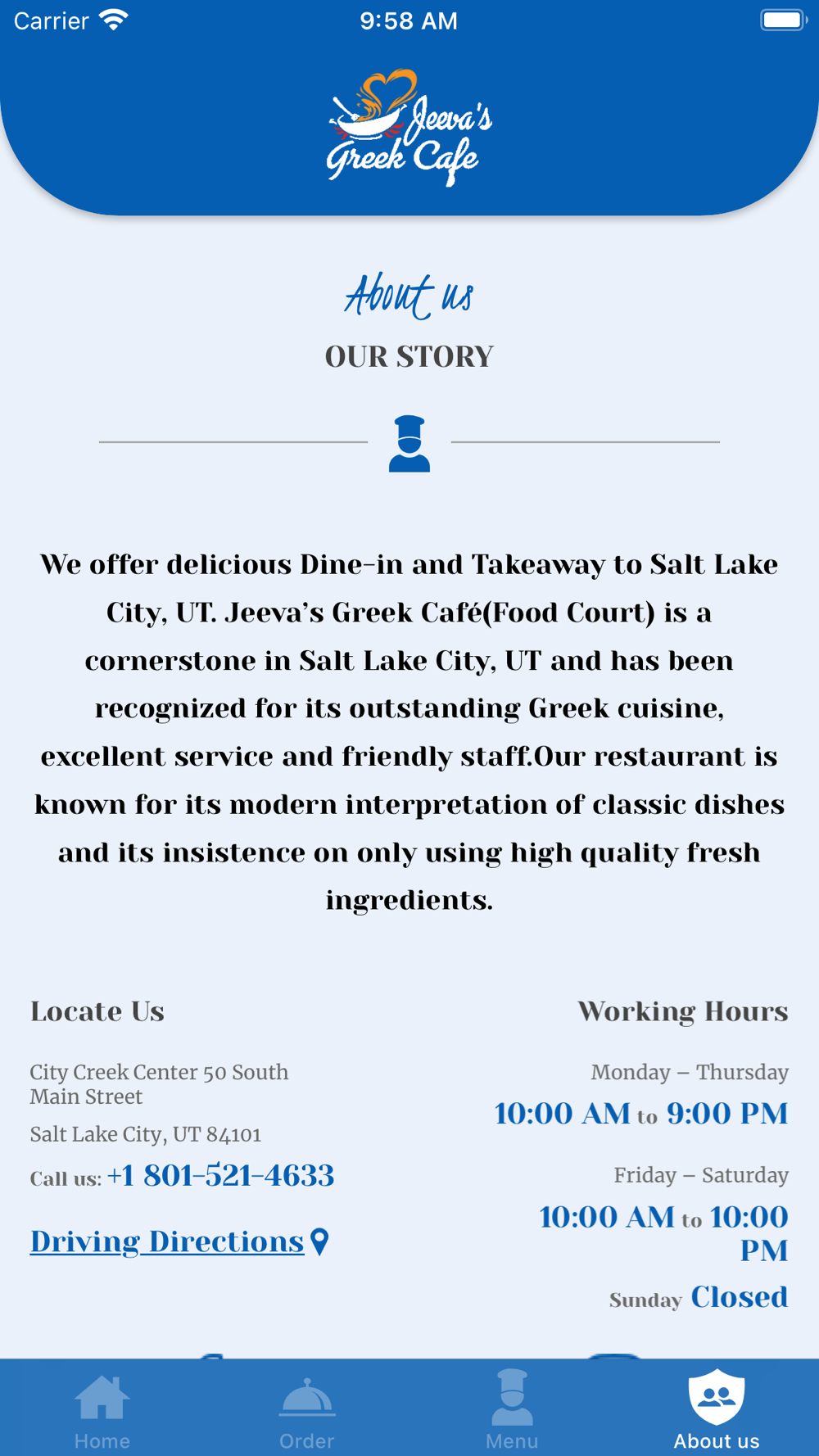 Jeeva’s Greek Café (Food Court) is a cornerstone in Salt Lake City, UT and has been recognized for its outstanding Greek cuisine, excellent service and friendly staff. Our restaurant is known for its modern interpretation of classic dishes and its insistence on only using high quality fresh ingredients.