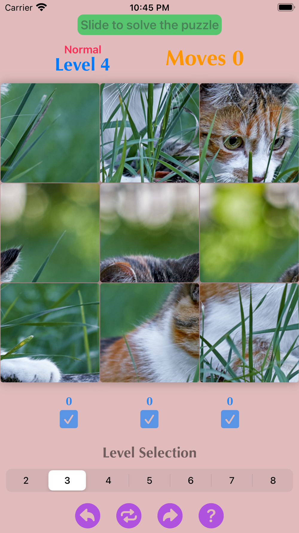 This is a jigsaw/puzzle game. Sliding the blocks to spell out cute pets. There are two modes: normal and hard. Swiping to exchange adjacent small blocks in normal mode. In hard mode, it’s like playing a Rubik's Cube except that you can fix a block if you want. The higher the level, the more blocks and the greater the difficulty. Wish you have great fun!