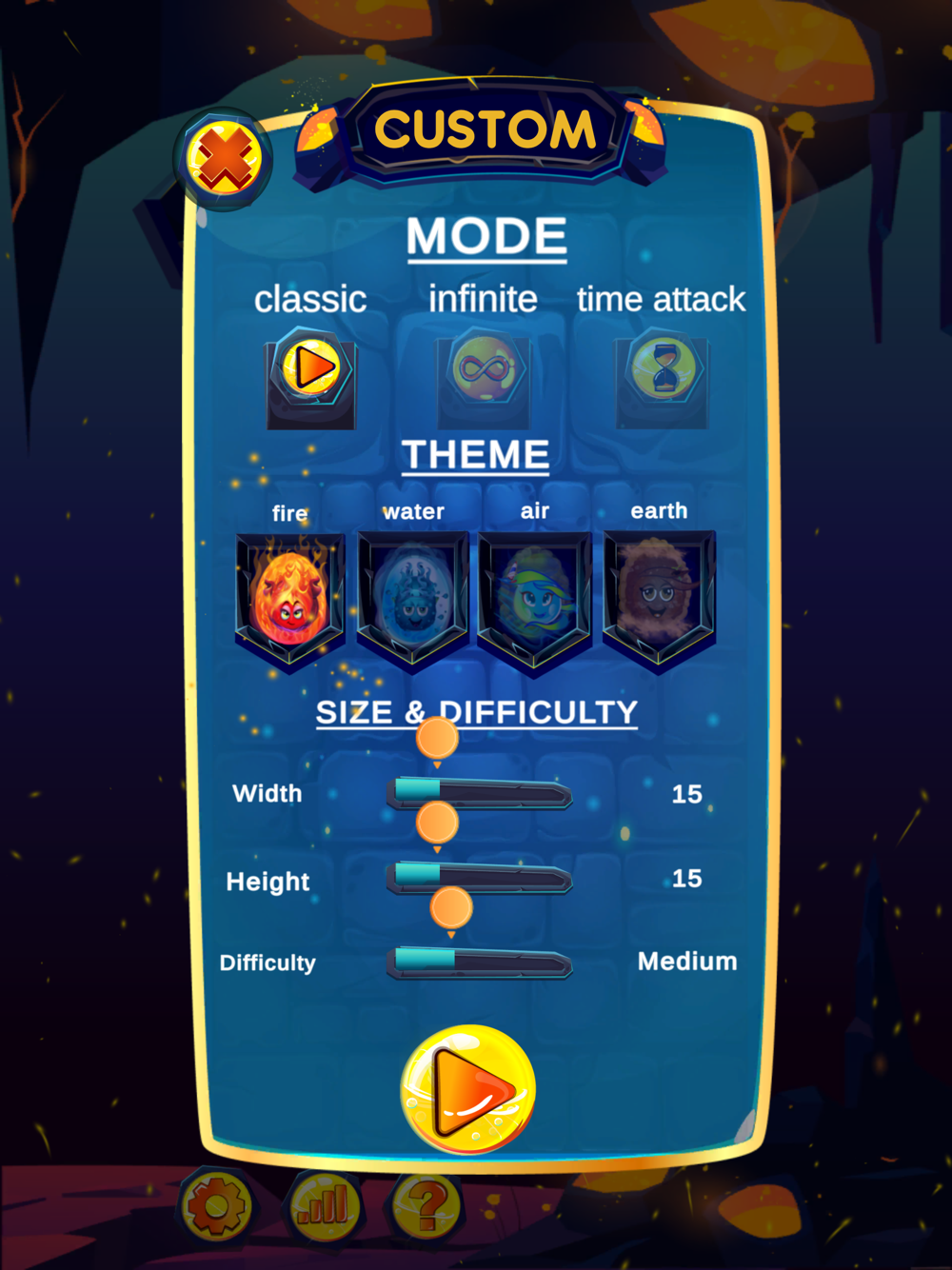 - Custom mode to select grid size, difficulty and theme.