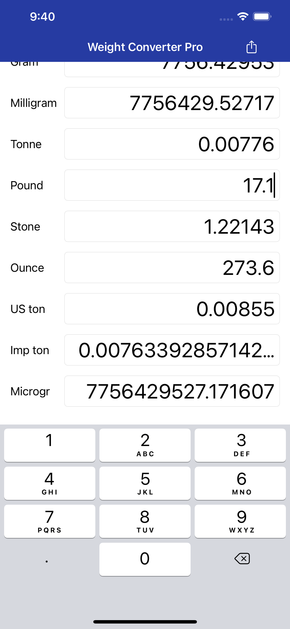 Weight Converter Pro the fast weight converter to convert for Stone, Pound, Ounce, Kg, Gram, Milligram, Microgram, Tonne, US tonne, Imperial tonne in real time and without any hassle.