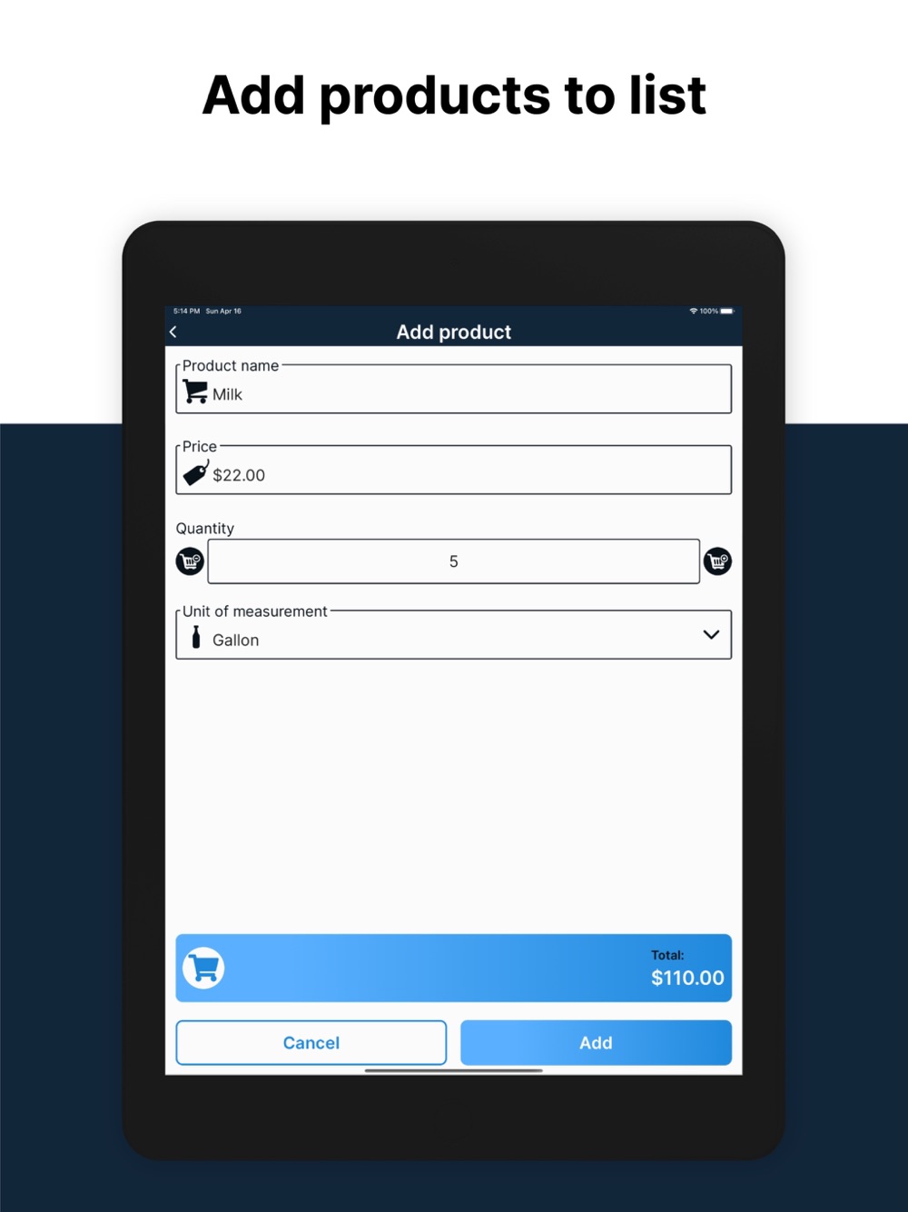 Then you can add all the products that you are going to buy or as you take them from the supermarket. You must assign at least a name to each product. You can also put the price and quantity of products taken and the total will be automatically calculated. You can modify the information of the lists that appear on the main screen, as well as modify prices, quantities, names of products and eliminate them from the list.