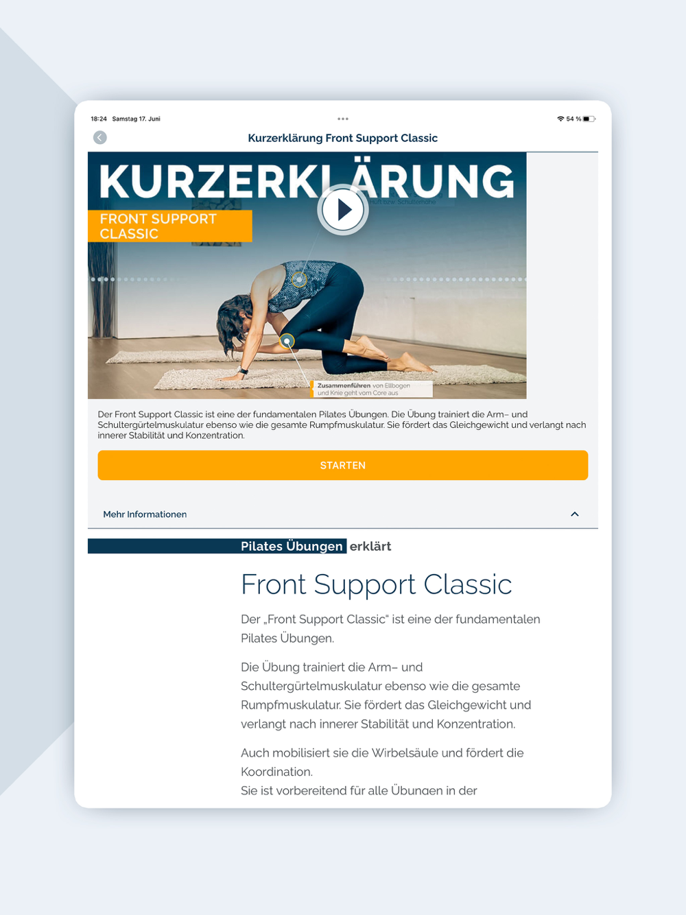 Alle Pilates Übungen werden sehr detailliert in Videoform erklärt.