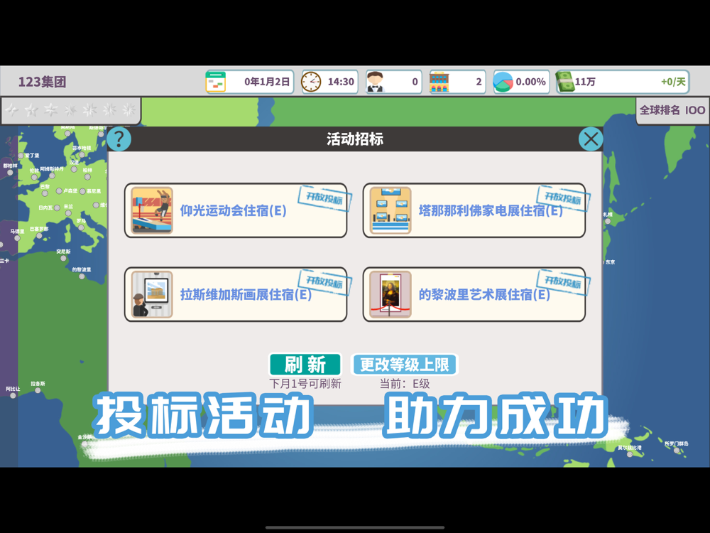 除了常规的客人之外,你还可以通过各种活动招标,来为各种展览活动、运动会提供住宿服务,竞标成功后不仅会获得资金奖励,还能获得名声,吸引更多的顾客。