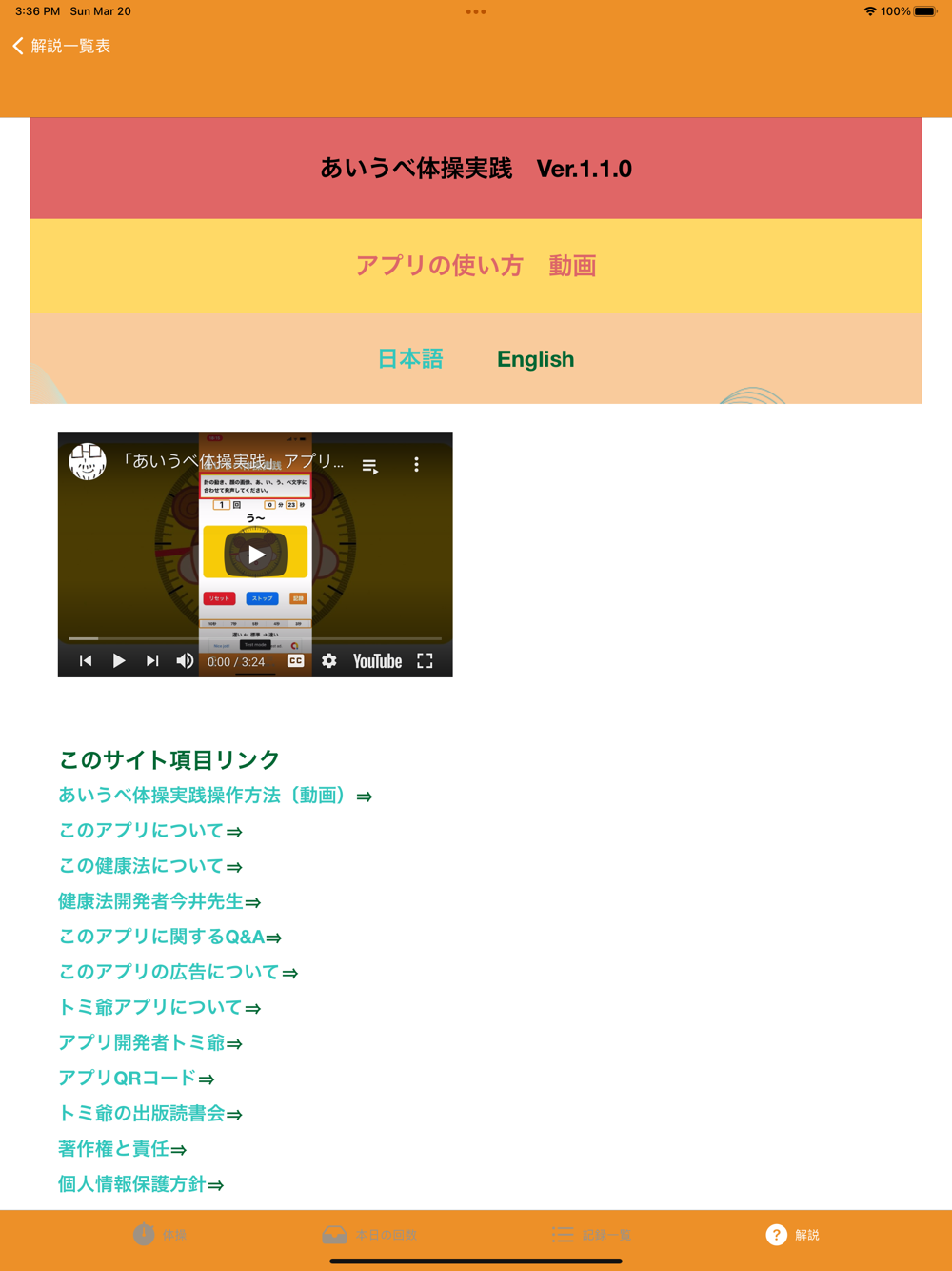 この機能は、正しい体操の方法を意外なほど忘れてしまうと実感して加えたものです。例えば「筋肉をしっかり動かせると効果も出やすいのでマンネリにならないよう意識しましょう。」という解説短文を載せましたが、私自身マンネリになって筋力トレーニングということを忘れて、形だけ「あ~」「い~」「う~」「べ~」を繰り返していた反省を込めたものです。