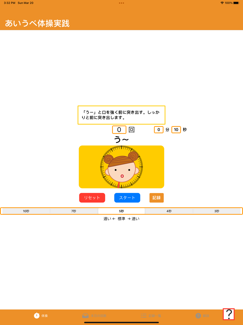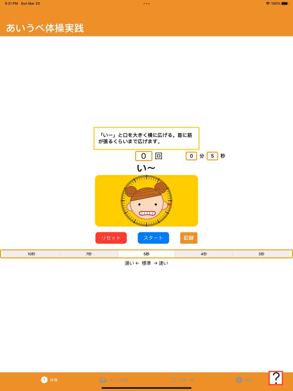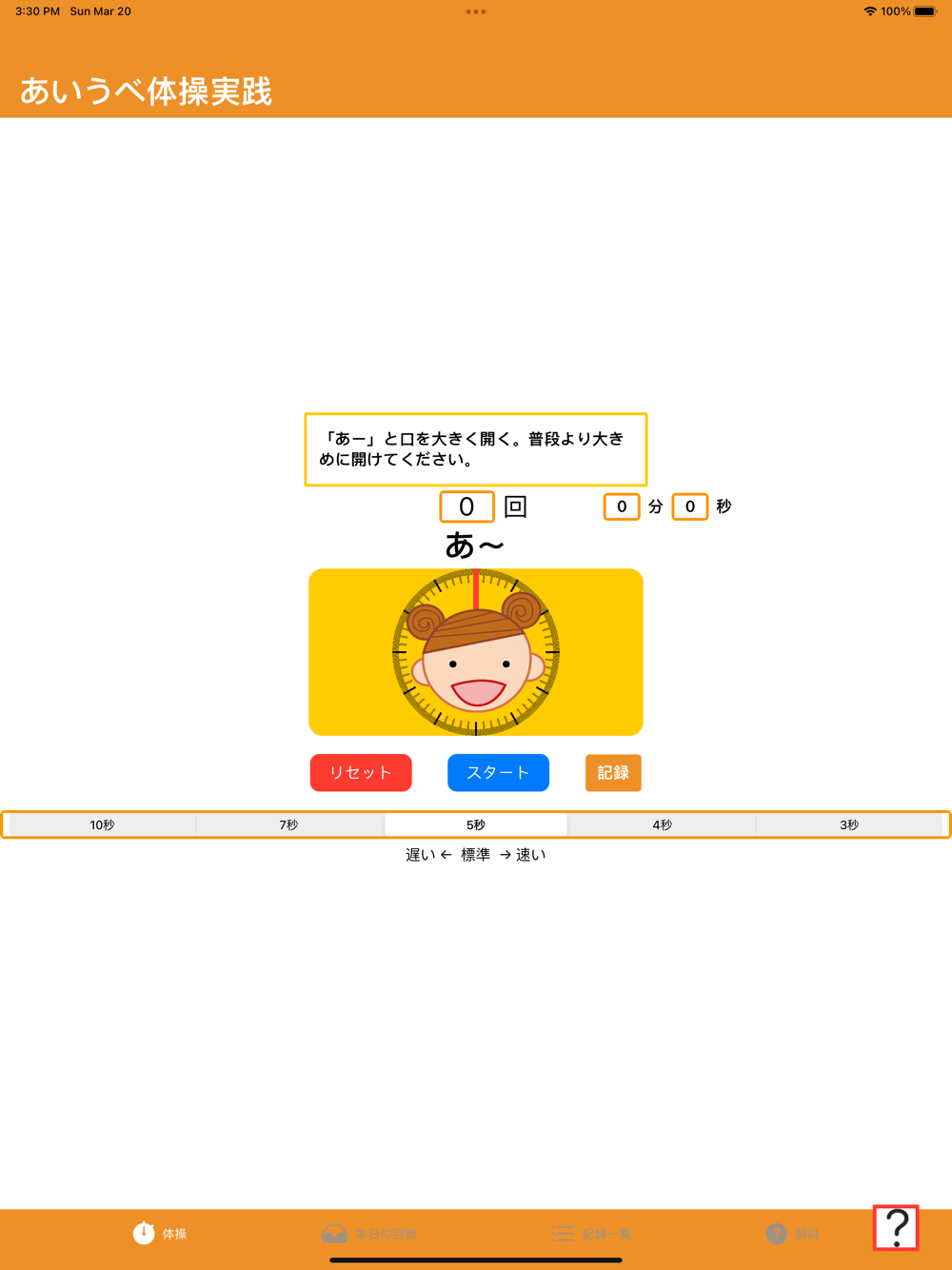 「あ~」「い~」「う~」「べ~」は標準で5秒で変わります。そのスピードを10秒、7秒、5秒、4秒、3秒に変えることができます。リセットボタンとスタートボタンの下のボタンを選択することで変更できます。スピードの変更に合わせて回数や経過時間も変更になります。この体操を始めて、当分の間は標準の5秒で実践することをお勧めします。将来必要に応じてスピードの変更を使ってください。