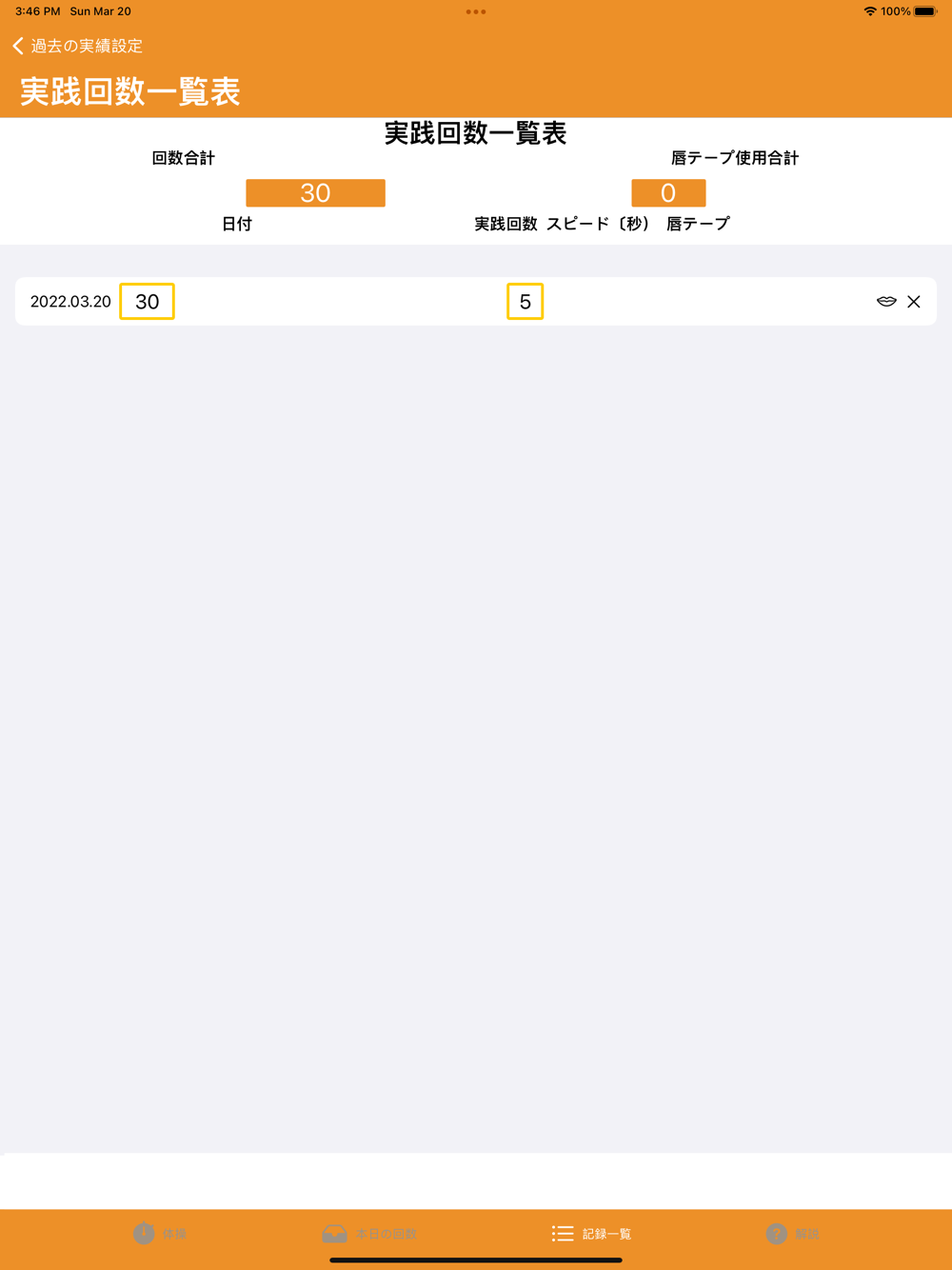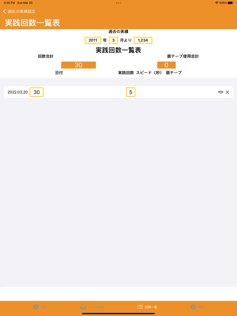 なお、初回はこのアプリを使う前に実践した回数を記録することができます。年月をスライドしてインプットし、過去の回数は項目に触れるとキーボードが現れますので数字をインプットしてください。過去の記録がなければ「過去の実践なし」ボタンを押してください。自動で次の一覧表に飛びます。2回目からは過去のインプット画面は現れず、直接一覧表が開かれます。