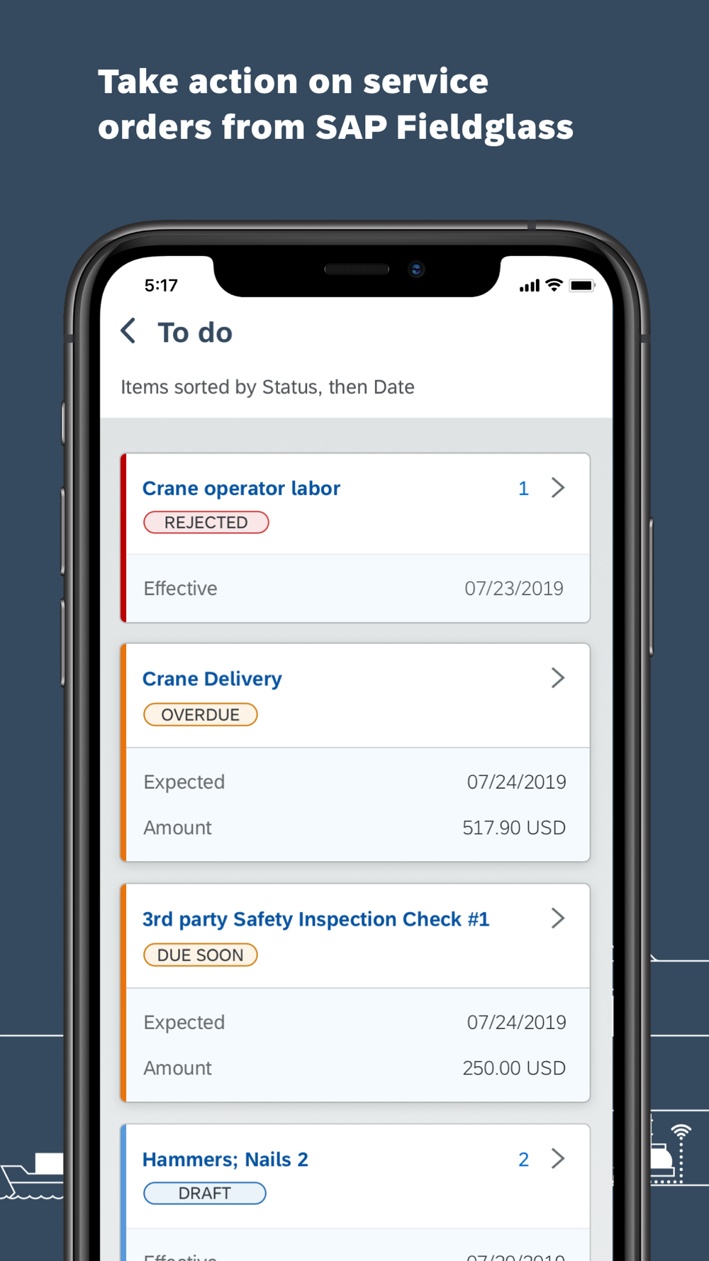 Designed for use by field service workers who have an existing SAP Fieldglass account, SAP Fieldglass Service Orders makes it easy to manage tasks directly from their mobile device. Users can view their assigned work items and tasks, mark items complete, and attach and enter a description for supporting documentation.